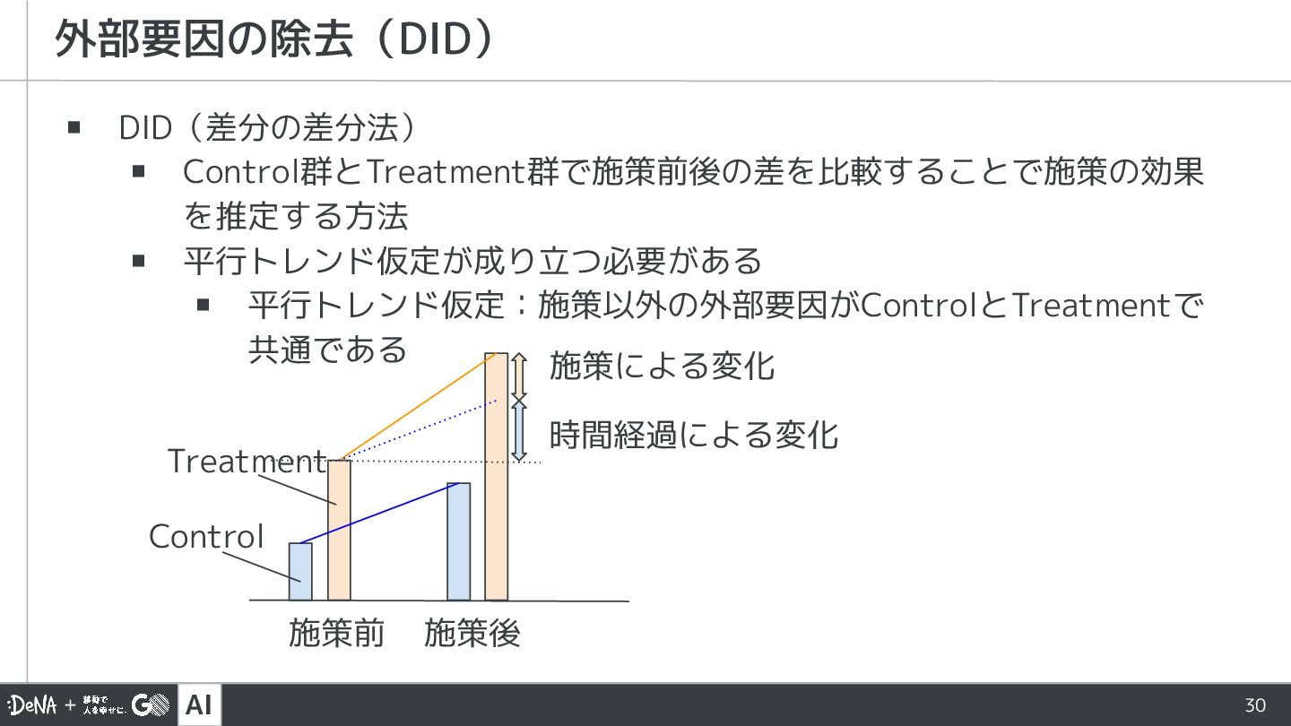 AI 30 ▪ DID(差分の差分法) ▪ Control群とTreatment群で施策前後の差を比較することで施策の効果 を推定する方法 ▪ 平行トレンド仮定が成り立つ必要がある ▪