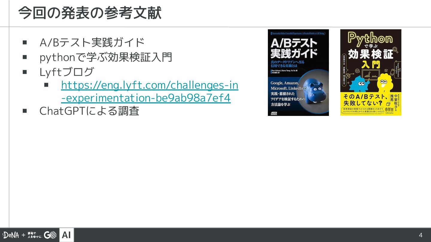 AI 4 ▪ A/Bテスト実践ガイド ▪ pythonで学ぶ効果検証入門 ▪ Lyftブログ ▪ https://eng.lyft.com/challenges-in