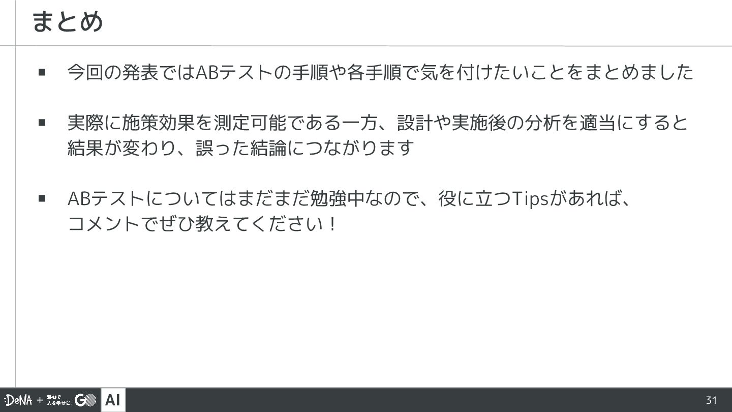 AI 31 ▪ 今回の発表ではABテストの手順や各手順で気を付けたいことをまとめました ▪ 実際に施策効果を測定可能である一方、設計や実施後の分析を適当にすると 結果が変わり、誤った結論につながります ▪ ABテストについてはまだまだ勉強中なので、役に立つTipsがあれば、 コメントでぜひ教えてください!