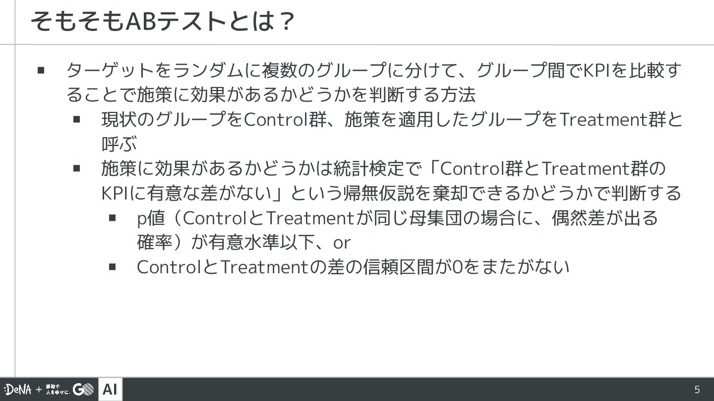 AI 5 ▪ ターゲットをランダムに複数のグループに分けて、グループ間でKPIを比較す ることで施策に効果があるかどうかを判断する方法 ▪ 現状のグループをControl群、施策を適用したグループをTreatment群と 呼ぶ ▪ 施策に効果があるかどうかは統計検定で「Control群とTreatment群の