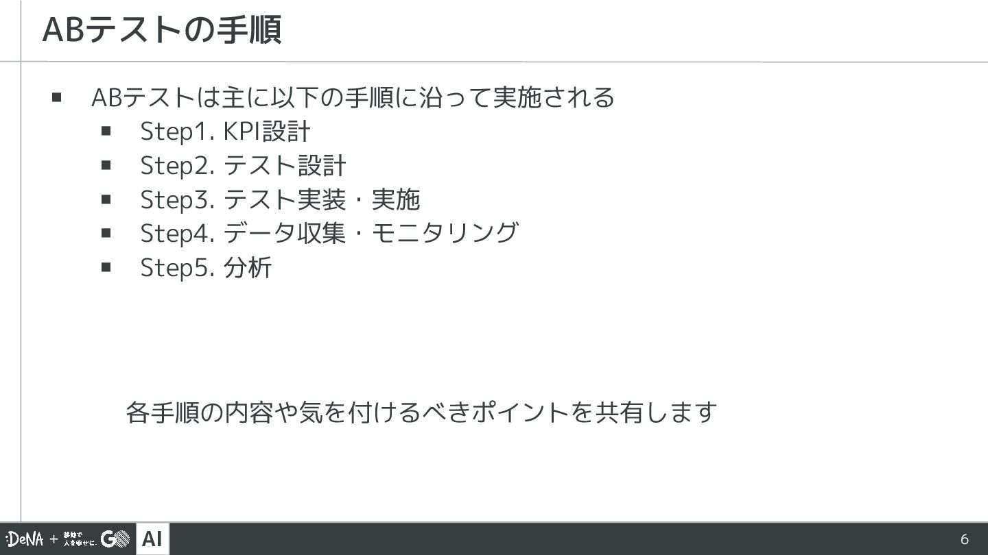 AI 6 ▪ ABテストは主に以下の手順に沿って実施される ▪ Step1. KPI設計 ▪ Step2. テスト設計