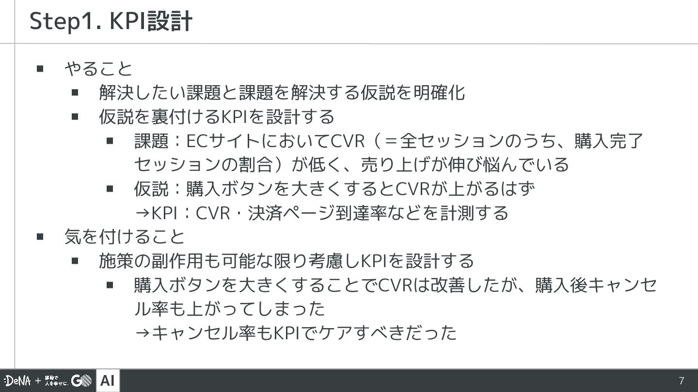 セッションの割合)が低く、売り上げが伸び悩んでいる ▪ 仮説:購入ボタンを大きくするとCVRが上がるはず →KPI:CVR・決済ページ到達率などを計測する ▪ 気を付けること ▪ 施策の副作用も可能な限り考慮しKPIを設計する ▪ 購入ボタンを大きくすることでCVRは改善したが、購入後キャンセ ル率も上がってしまった →キャンセル率もKPIでケアすべきだった Step1. KPI設計