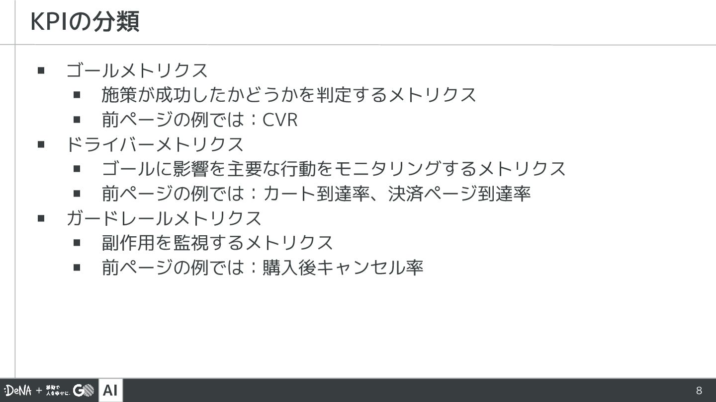 AI 8 ▪ ゴールメトリクス ▪ 施策が成功したかどうかを判定するメトリクス ▪ 前ページの例では:CVR ▪ ドライバーメトリクス