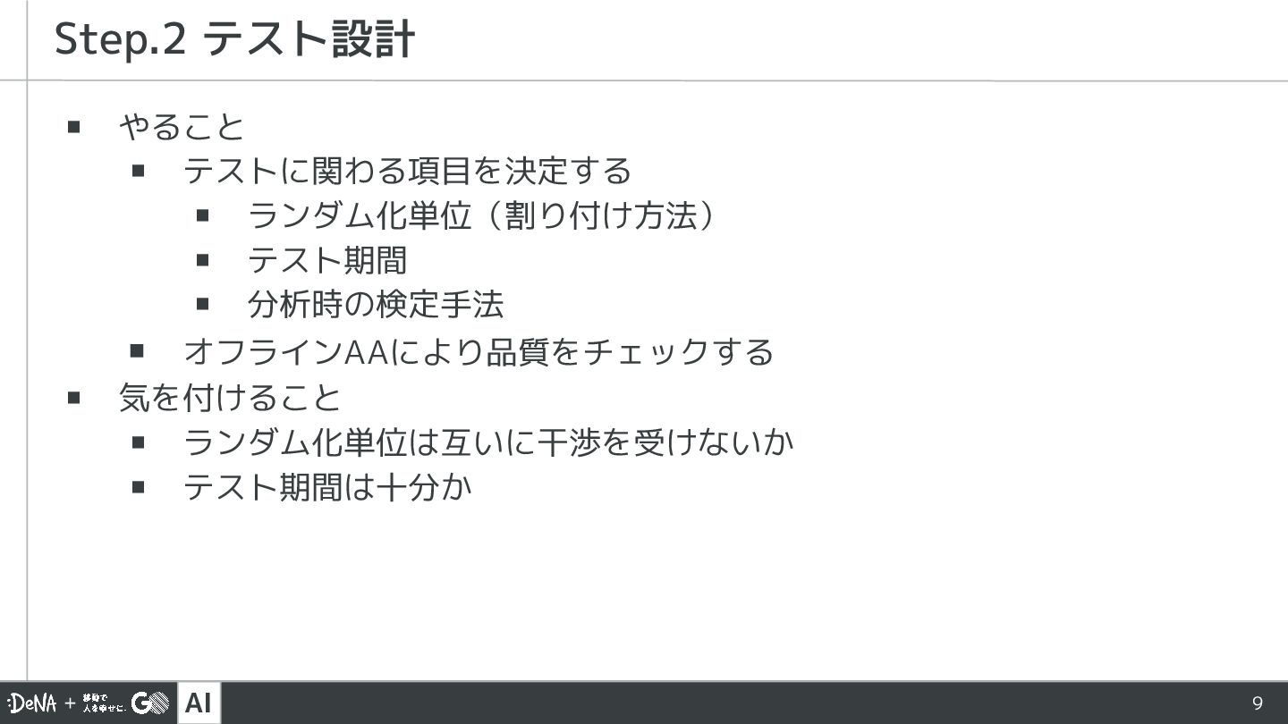▪ 分析時の検定手法 ▪ オフラインAAにより品質をチェックする ▪ 気を付けること ▪ ランダム化単位は互いに干渉を受けないか ▪ テスト期間は十分か Step.2 テスト設計