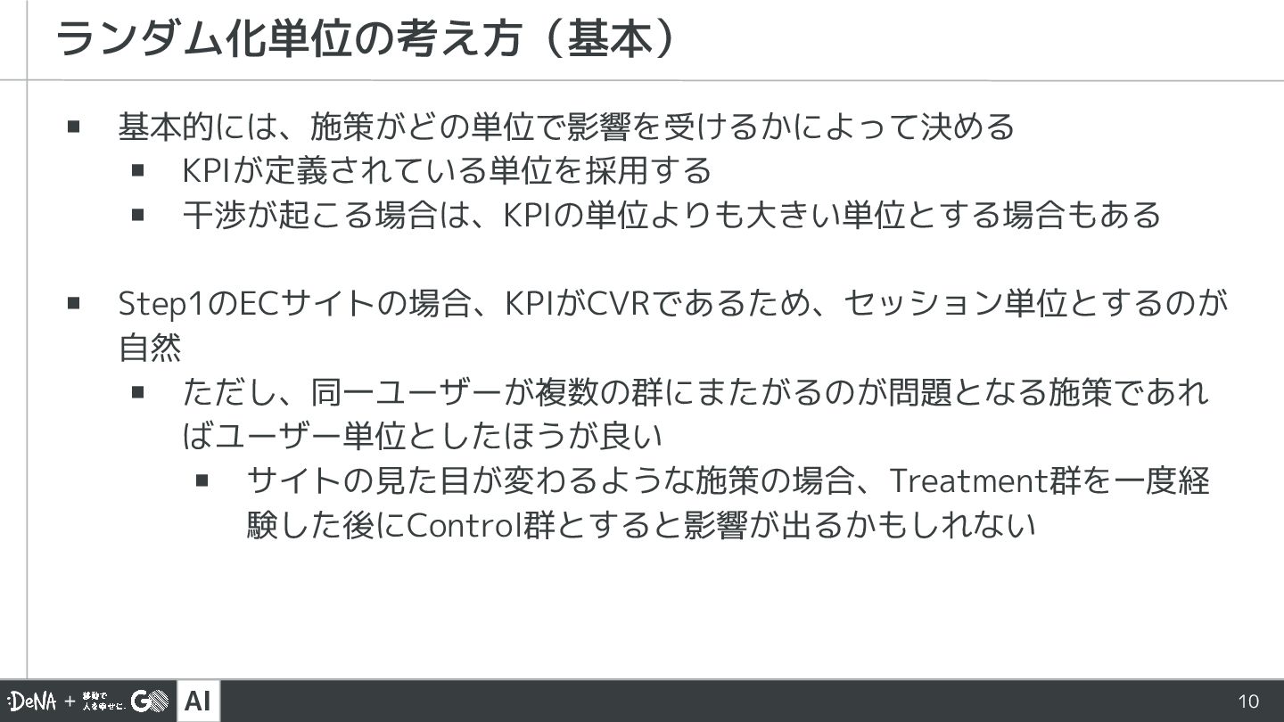 AI 10 ▪ 基本的には、施策がどの単位で影響を受けるかによって決める ▪ KPIが定義されている単位を採用する ▪ 干渉が起こる場合は、KPIの単位よりも大きい単位とする場合もある ▪ Step1のECサイトの場合、KPIがCVRであるため、セッション単位とするのが