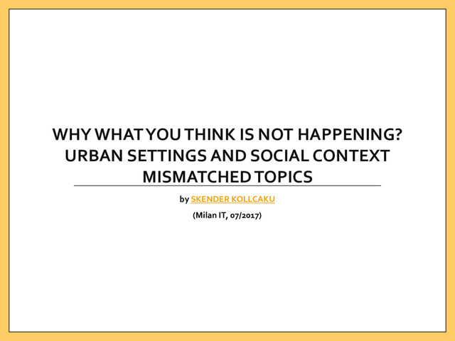 smart city, technology, IoT, urban innovation, city, Internet, Big Data, social, project, community, urban planning, future, connectivity, urban design, analytics, artificial intelligence, infrastructure, city-as-a-service, neighborhood, interactive, public administration, art, heritage, local "Why what you think is not happening? Urban settings and social context mismatched topics" by Skender Kollcaku 14
