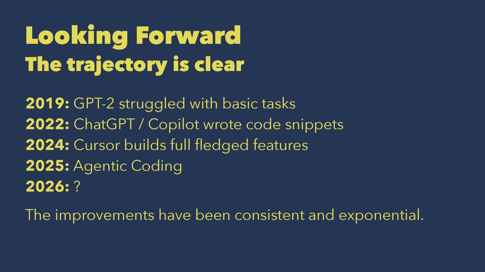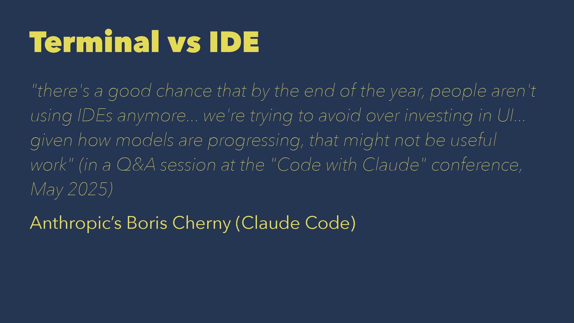 end of the year, people aren't using IDEs anymore... we're trying to avoid over investing in UI... given how models are progressing, that might not be useful work" (in a Q&A session at the "Code with Claude" conference, May 2025) Anthropic’s Boris Cherny (Claude Code)