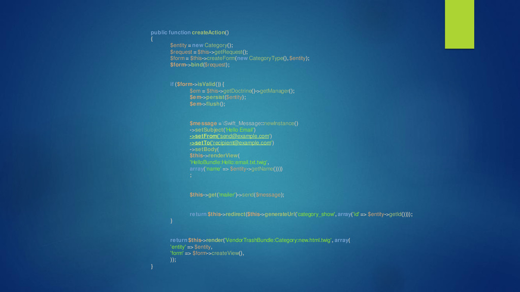 [email protected]') ->setBody( $this->renderView( 'HelloBundle:Hello:email.txt.twig', array('name' => $entity->getName()))) ; $this->get('mailer')->send($message); return $this->redirect($this->generateUrl('category_show', array('id' => $entity->getId()))); } return $this->render('VendorTrashBundle:Category:new.html.twig', array( 'entity' => $entity, 'form' => $form->createView(), )); }