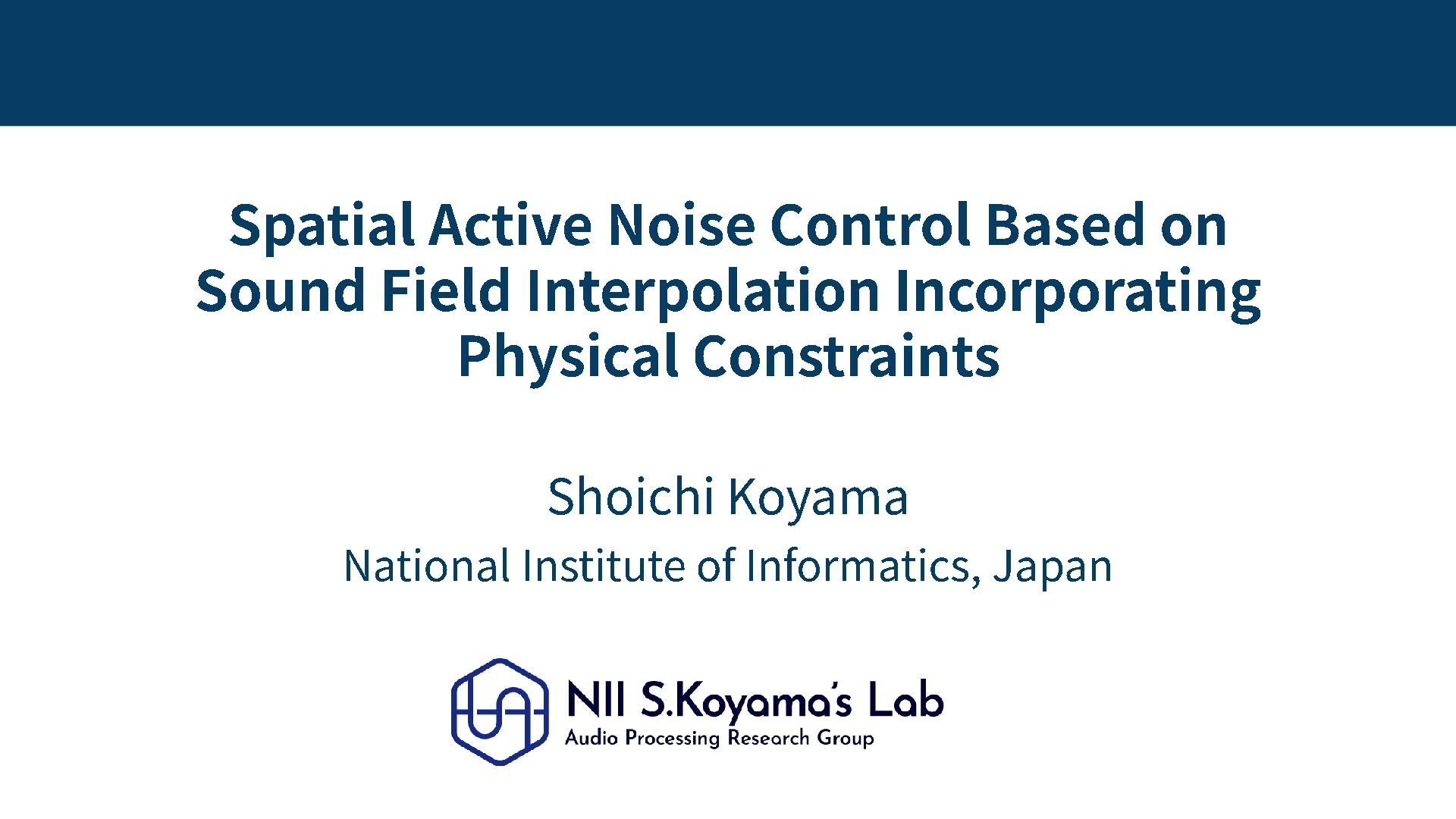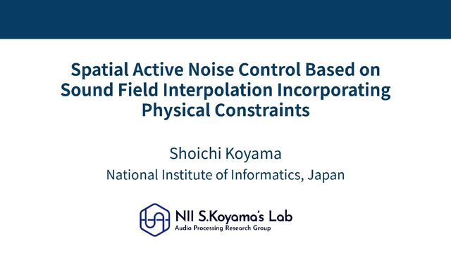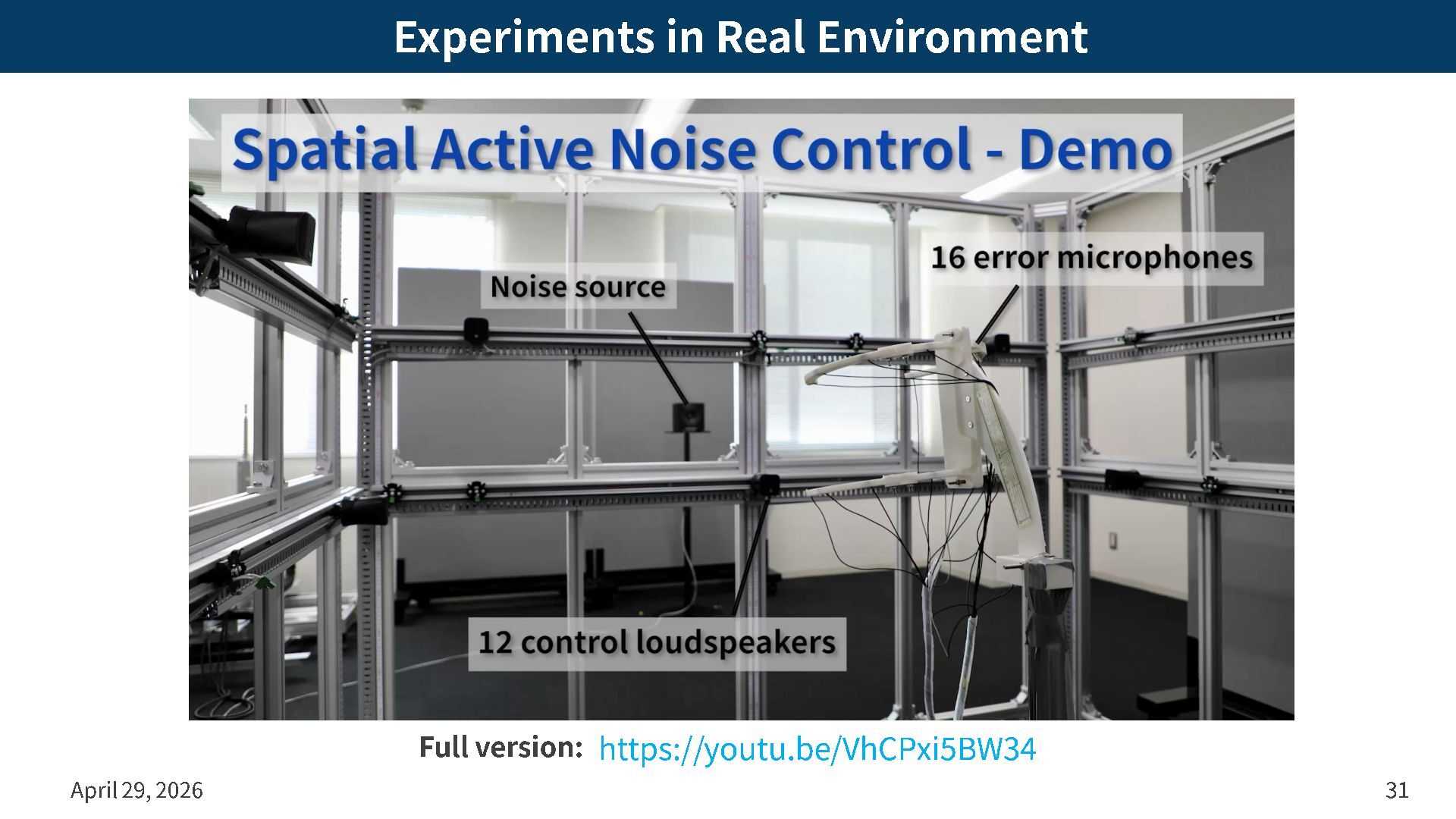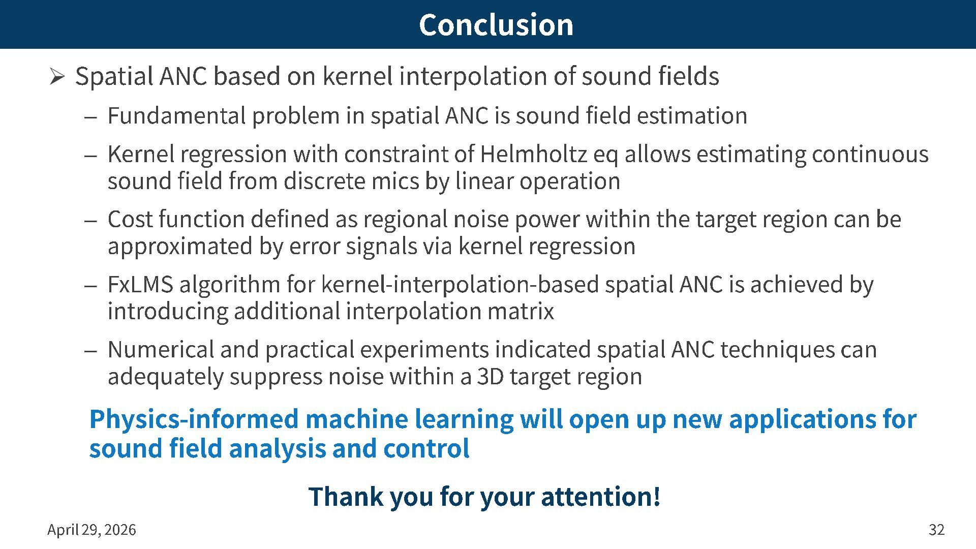 fields – Fundamental problem in spatial ANC is sound field estimation – Kernel regression with constraint of Helmholtz eq allows estimating continuous sound field from discrete mics by linear operation – Cost function defined as regional noise power within the target region can be approximated by error signals via kernel regression – FxLMS algorithm for kernel -interpolation -based spatial ANC is achieved by introducing additional interpolation matrix – Numerical and practical experiments indicated spatial ANC techniques can adequately suppress noise within a 3D target region April 29, 2026 32 Physics -informed machine learning will open up new applications for sound field analysis and control Thank you for your attention!