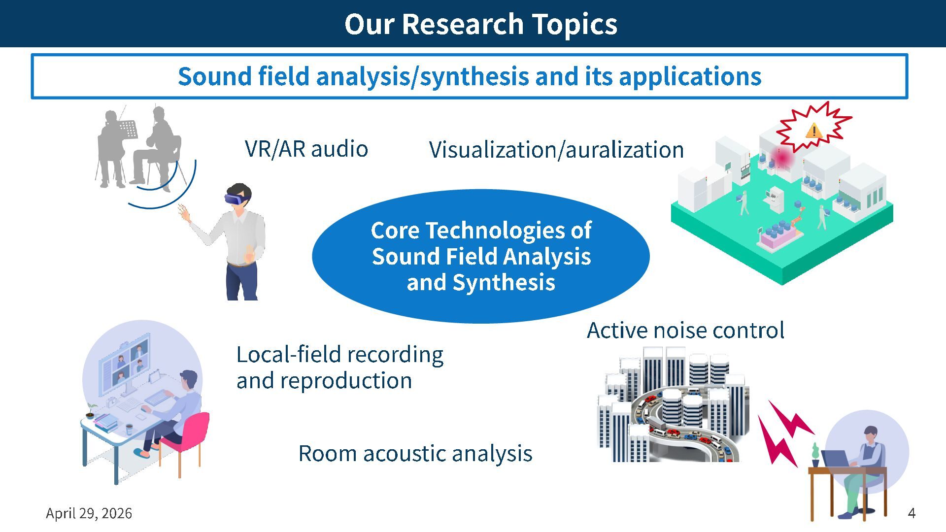 -field recording and reproduction Visualization/auralization Room acoustic analysis Our Research Topics Sound field analysis/synthesis and its applications Core Technologies of Sound Field Analysis and Synthesis