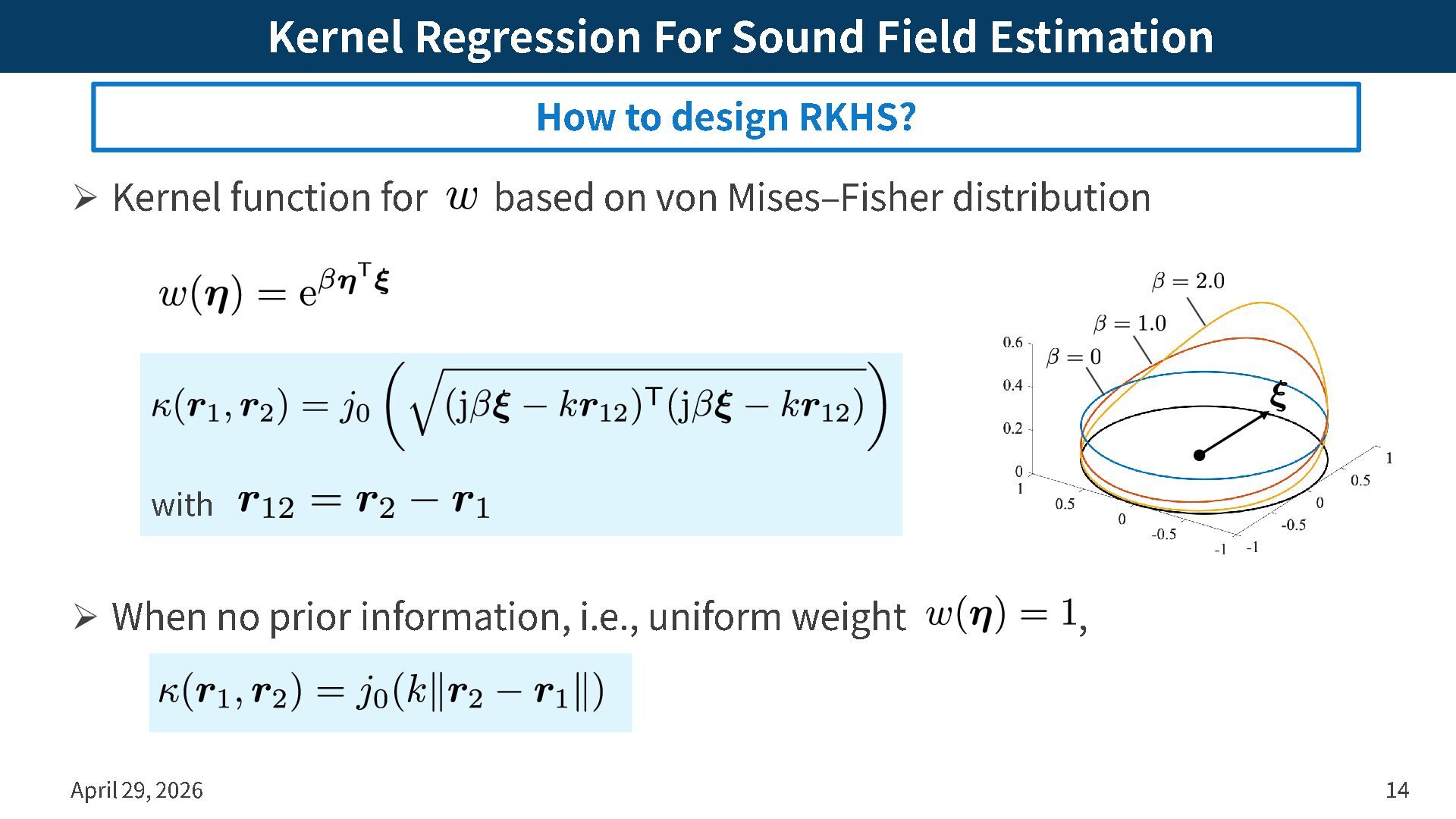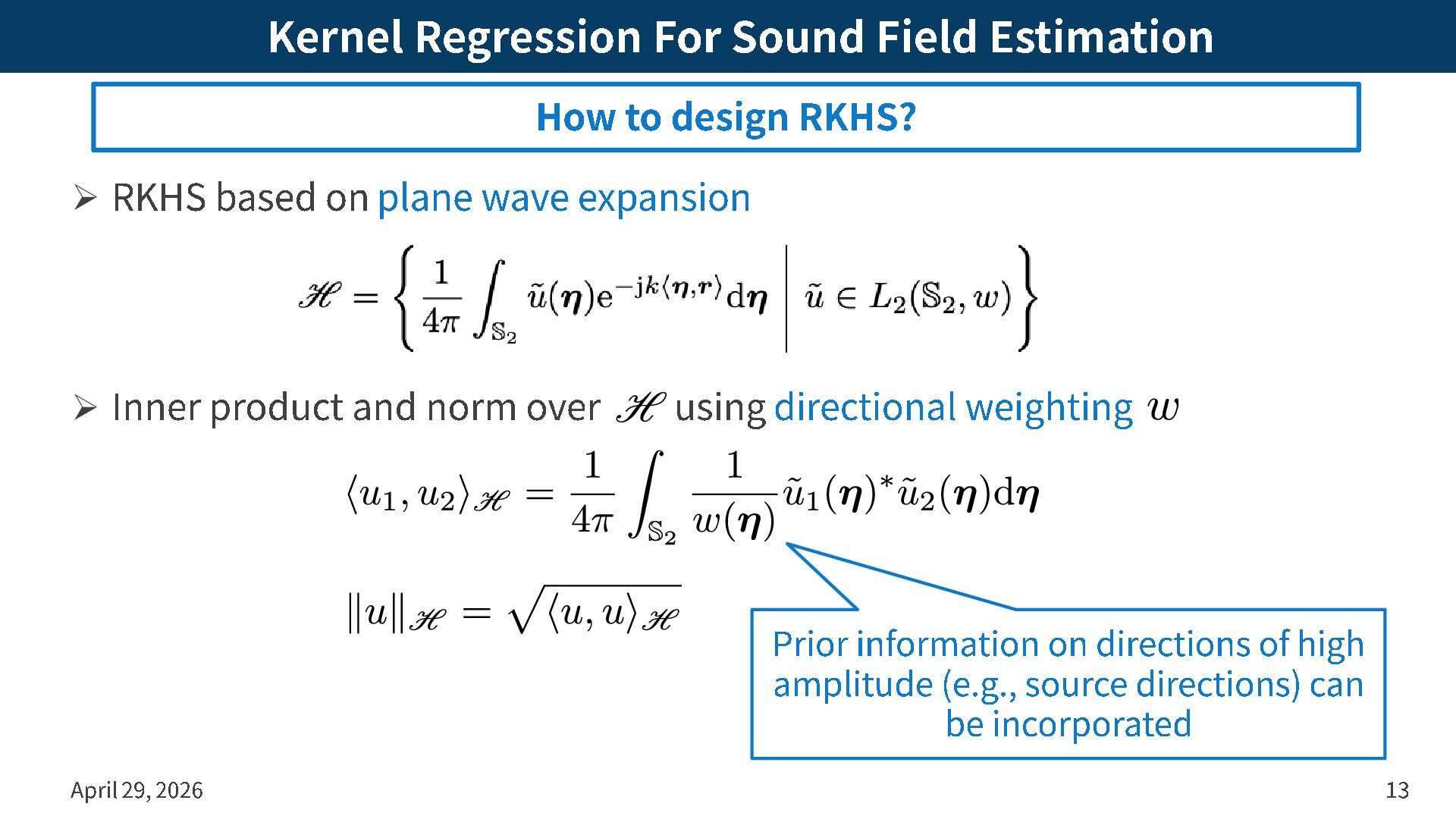 plane wave expansion ➢ Inner product and norm over using directional weighting April 29, 2026 13 How to design RKHS? Prior information on directions of high amplitude (e.g., source directions) can be incorporated