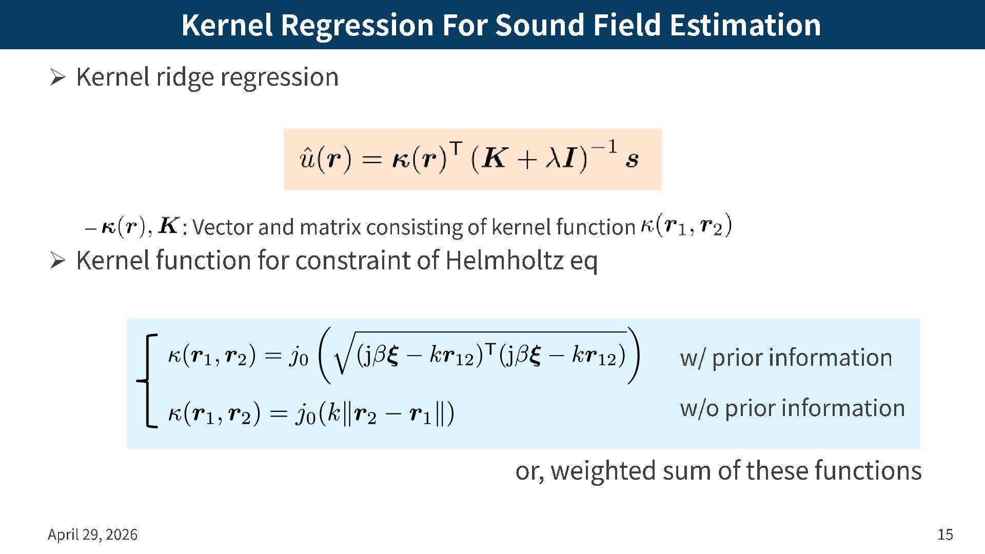 – : Vector and matrix consisting of kernel function ➢ Kernel function for constraint of Helmholtz eq April 29, 2026 15 w/ prior information w/o prior information or, weighted sum of these functions