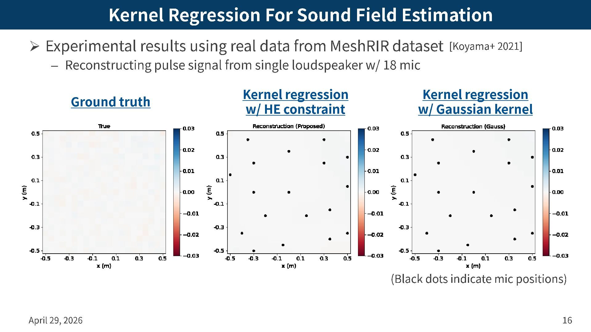 real data from MeshRIR dataset – Reconstructing pulse signal from single loudspeaker w/ 18 mic April 29, 2026 16 Ground truth Kernel regression w/ HE constraint Kernel regression w/ Gaussian kernel (Black dots indicate mic positions) [Koyama+ 2021]
