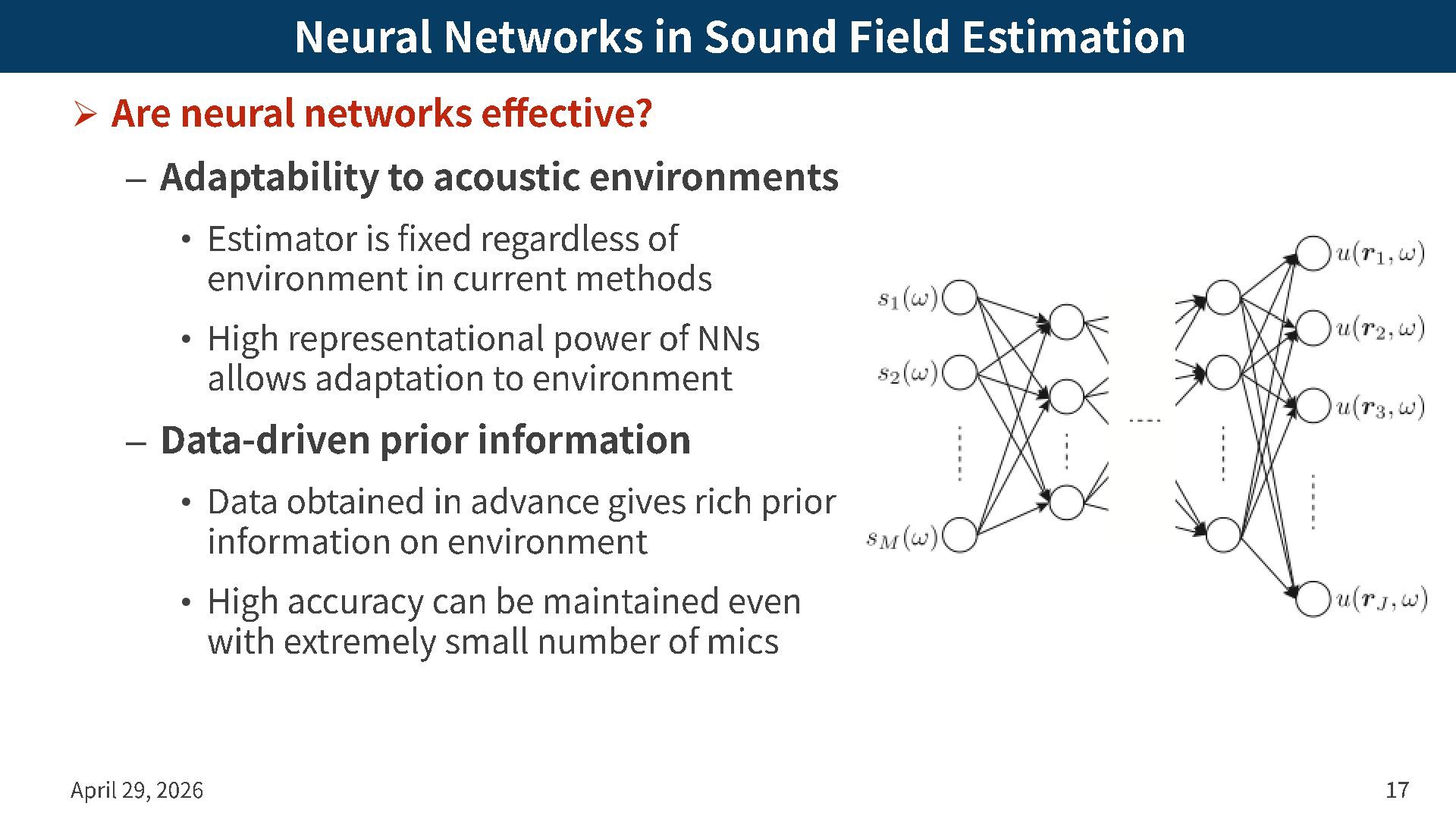 effective? – Adaptability to acoustic environments • Estimator is fixed regardless of environment in current methods • High representational power of NNs allows adaptation to environment – Data -driven prior information • Data obtained in advance gives rich prior information on environment • High accuracy can be maintained even with extremely small number of mics April 29, 2026 17