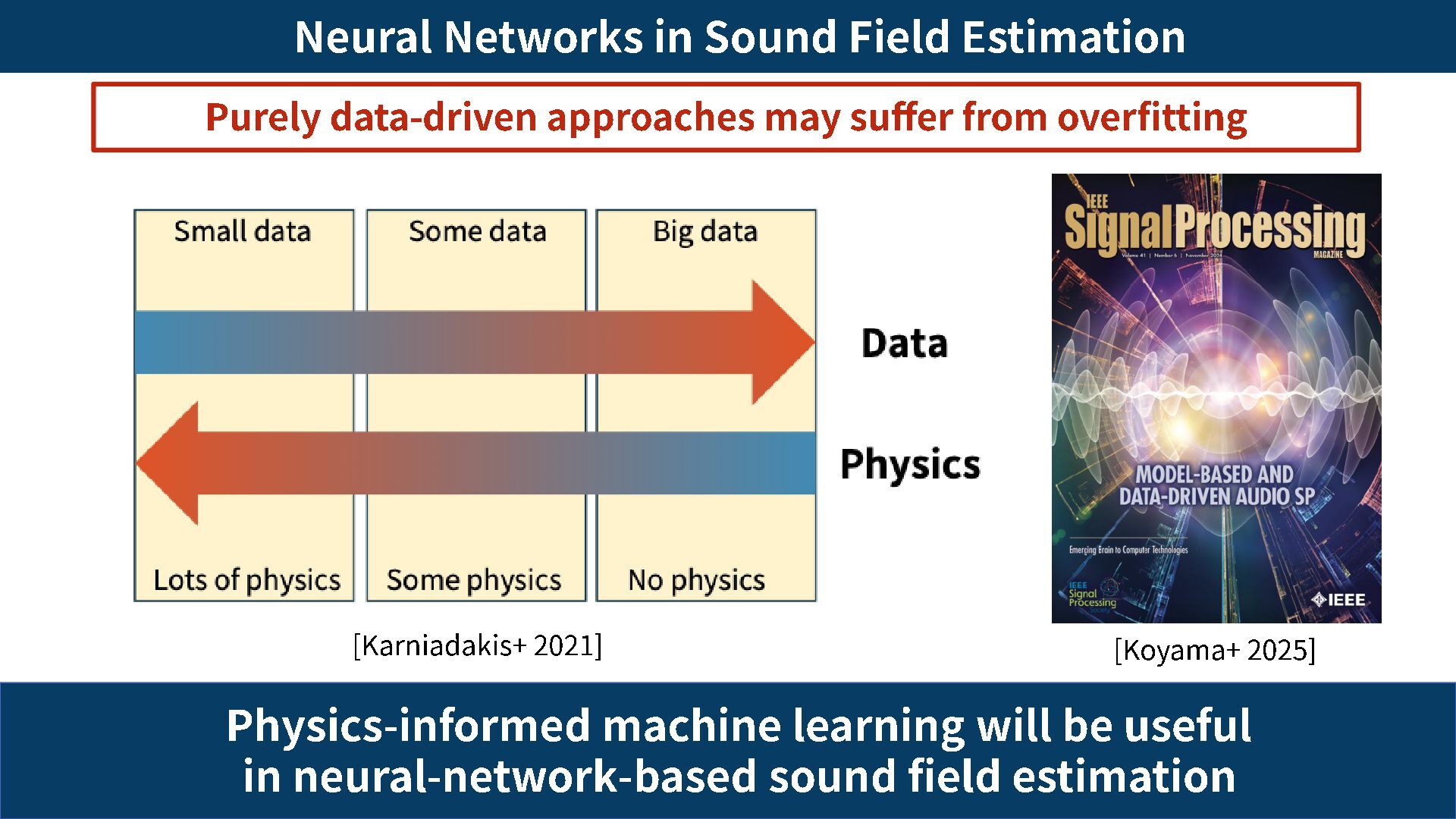 Purely data -driven approaches may suffer from overfitting [Karniadakis+ 2021] [Koyama+ 2025] Physics -informed machine learning will be useful in neural -network -based sound field estimation