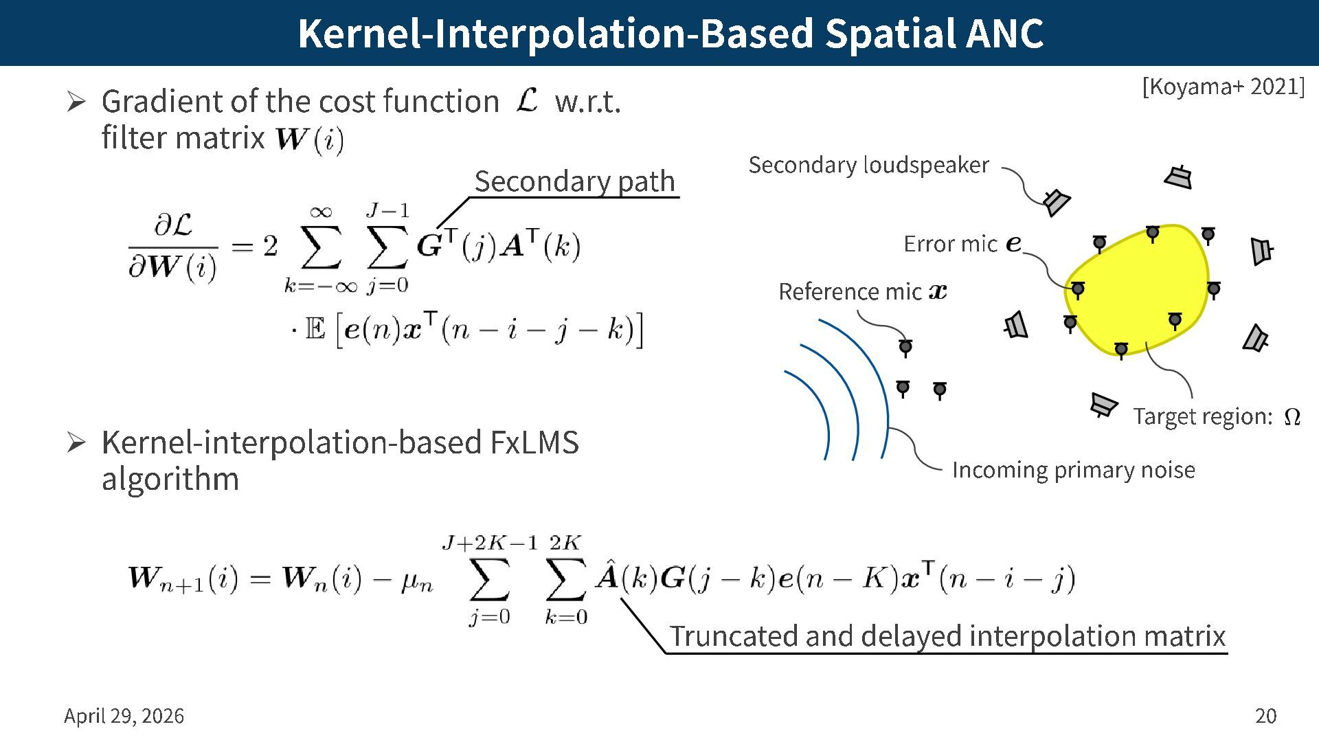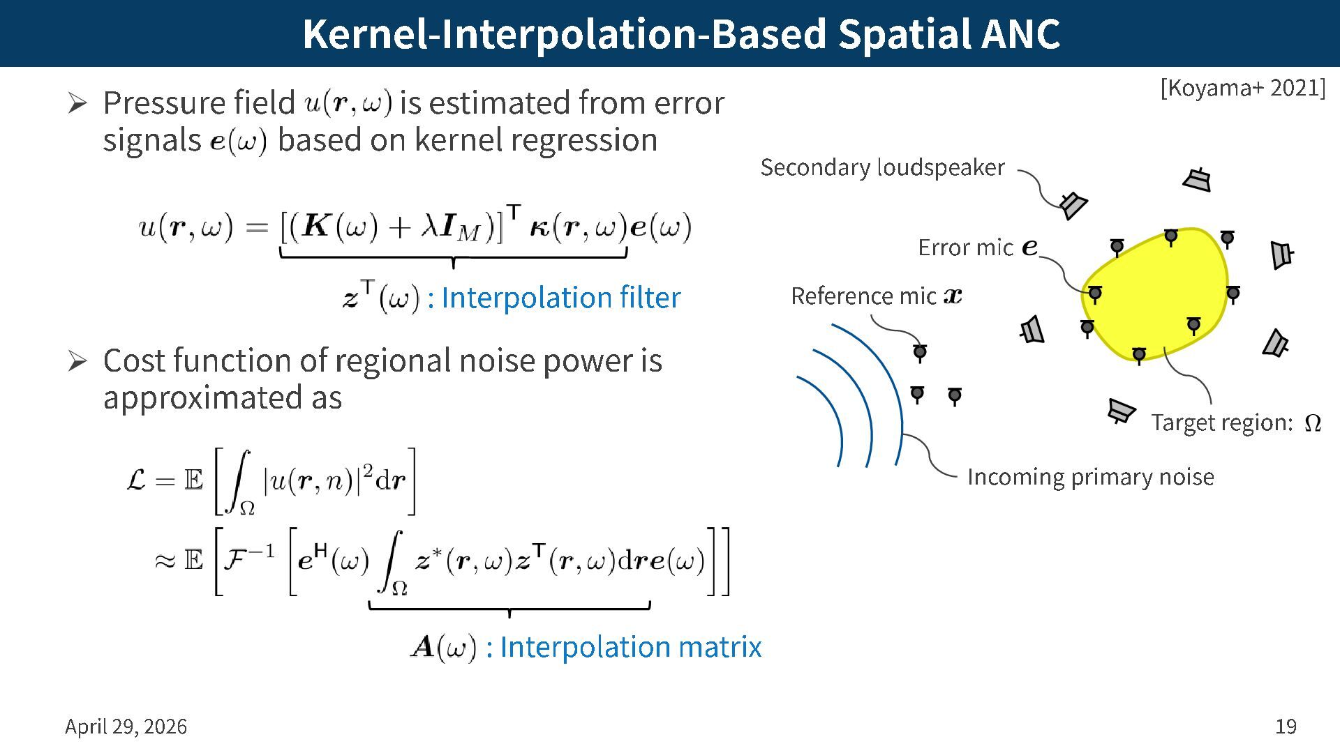from error signals based on kernel regression ➢ Cost function of regional noise power is approximated as April 29, 2026 19 : Interpolation filter : Interpolation matrix [Koyama+ 2021] Error mic Secondary loudspeaker Incoming primary noise Reference mic Target region: