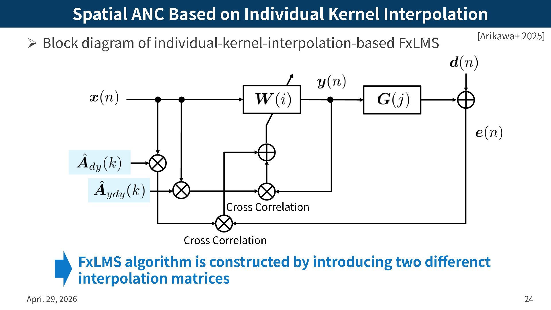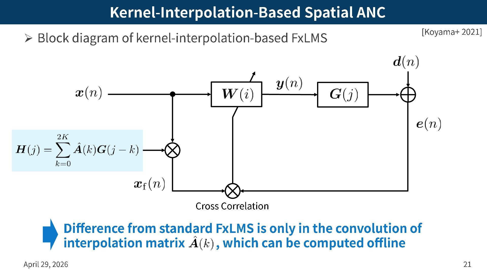 -interpolation -based FxLMS April 29, 2026 21 [Koyama+ 2021] Difference from standard FxLMS is only in the convolution of interpolation matrix , which can be computed offline Cross Correlation
