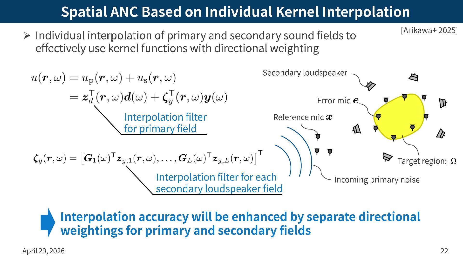 of primary and secondary sound fields to effectively use kernel functions with directional weighting April 29, 2026 22 [Arikawa+ 2025 ] Error mic Secondary loudspeaker Incoming primary noise Reference mic Target region: Interpolation accuracy will be enhanced by separate directional weightings for primary and secondary fields Interpolation filter for primary field Interpolation filter for each secondary loudspeaker field
