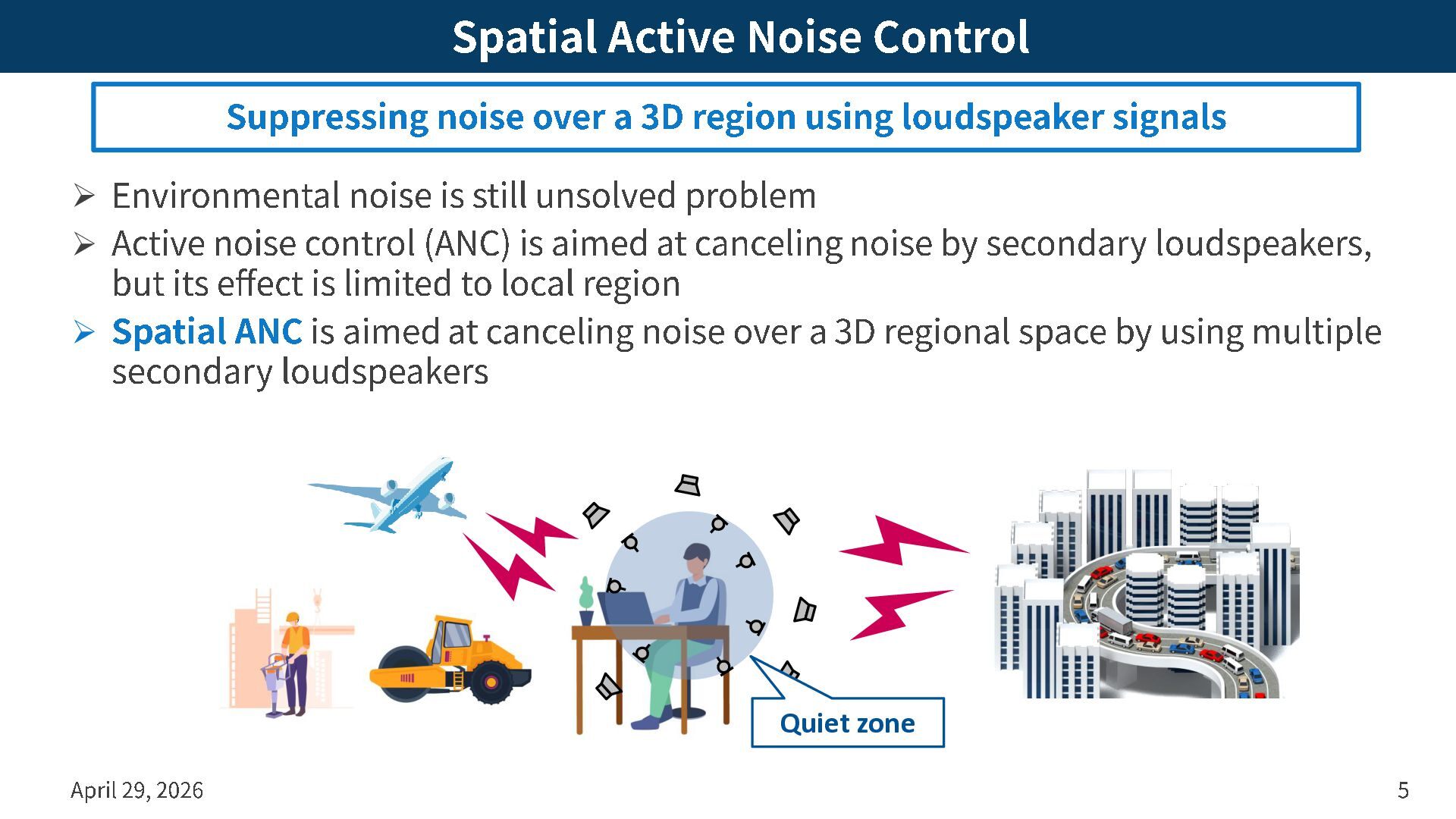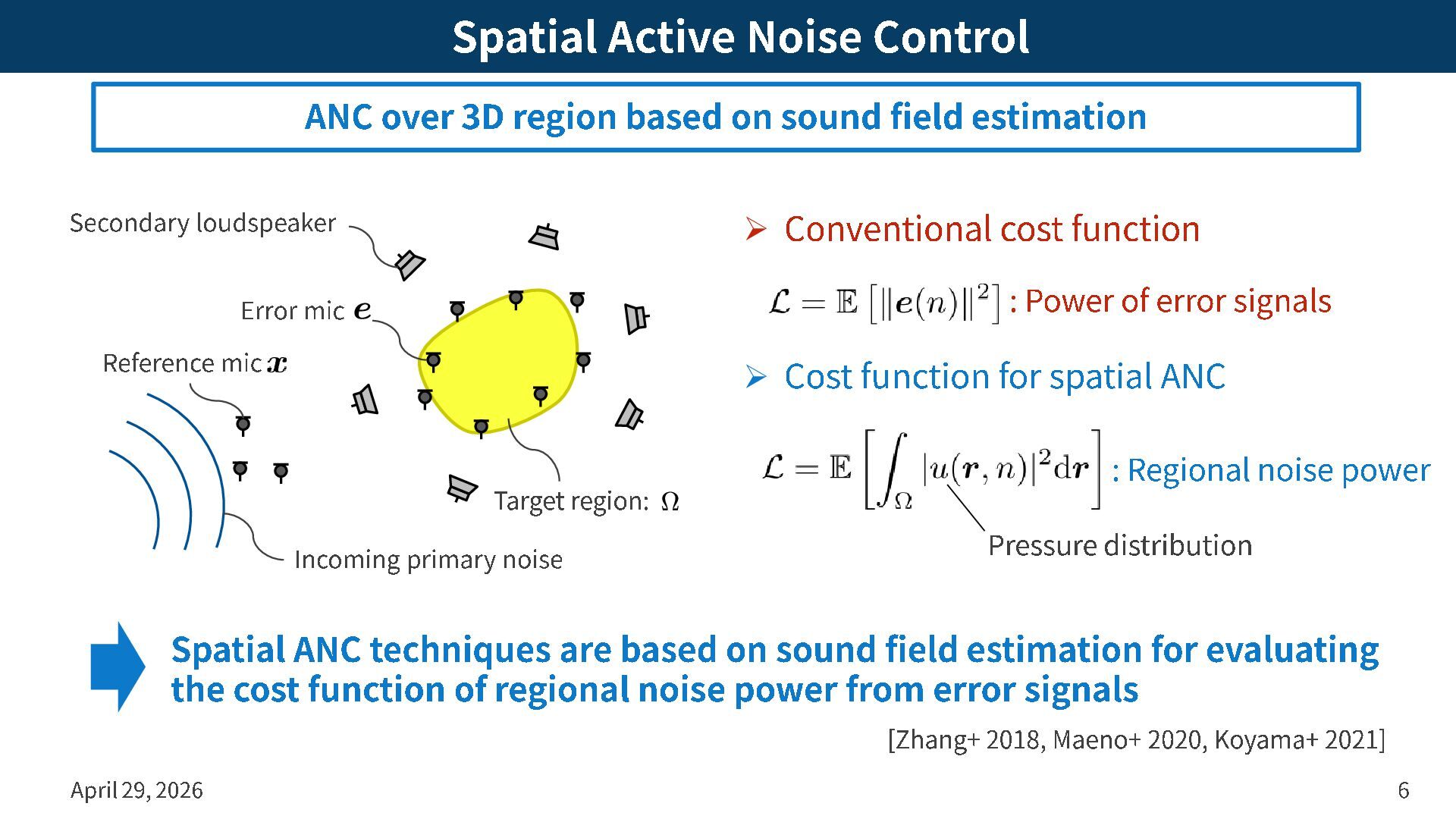problem ➢ Active noise control (ANC) is aimed at canceling noise by secondary loudspeakers, but its effect is limited to local region ➢ Spatial ANC is aimed at canceling noise over a 3D regional space by using multiple secondary loudspeakers April 29, 2026 5 Suppressing noise over a 3D region using loudspeaker signals Quiet zone