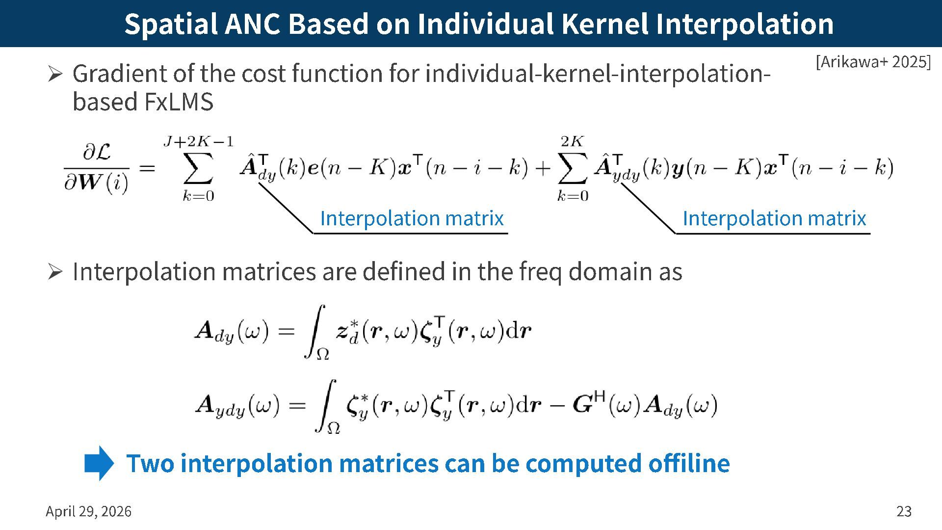 the cost function for individual -kernel -interpolation - based FxLMS ➢ Interpolation matrices are defined in the freq domain as April 29, 2026 23 [Arikawa+ 2025 ] Interpolation matrix Interpolation matrix Two interpolation matrices can be computed offiline