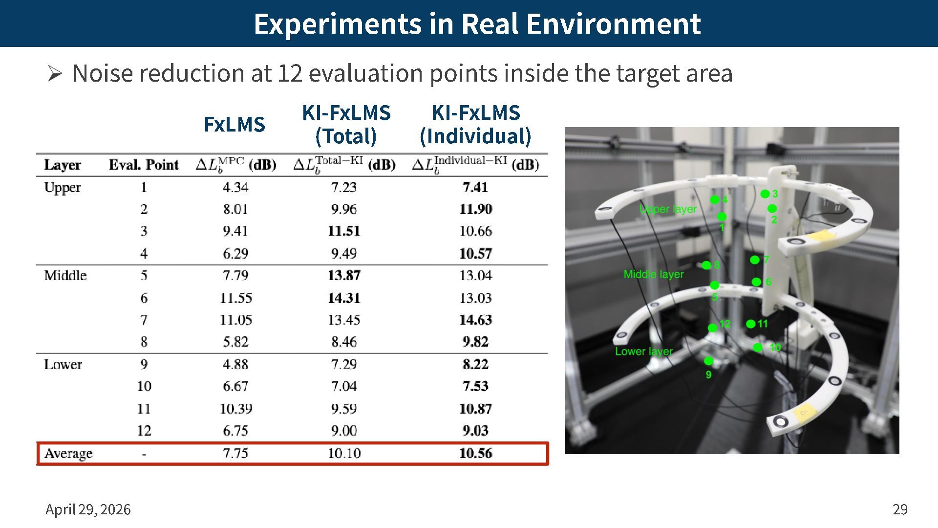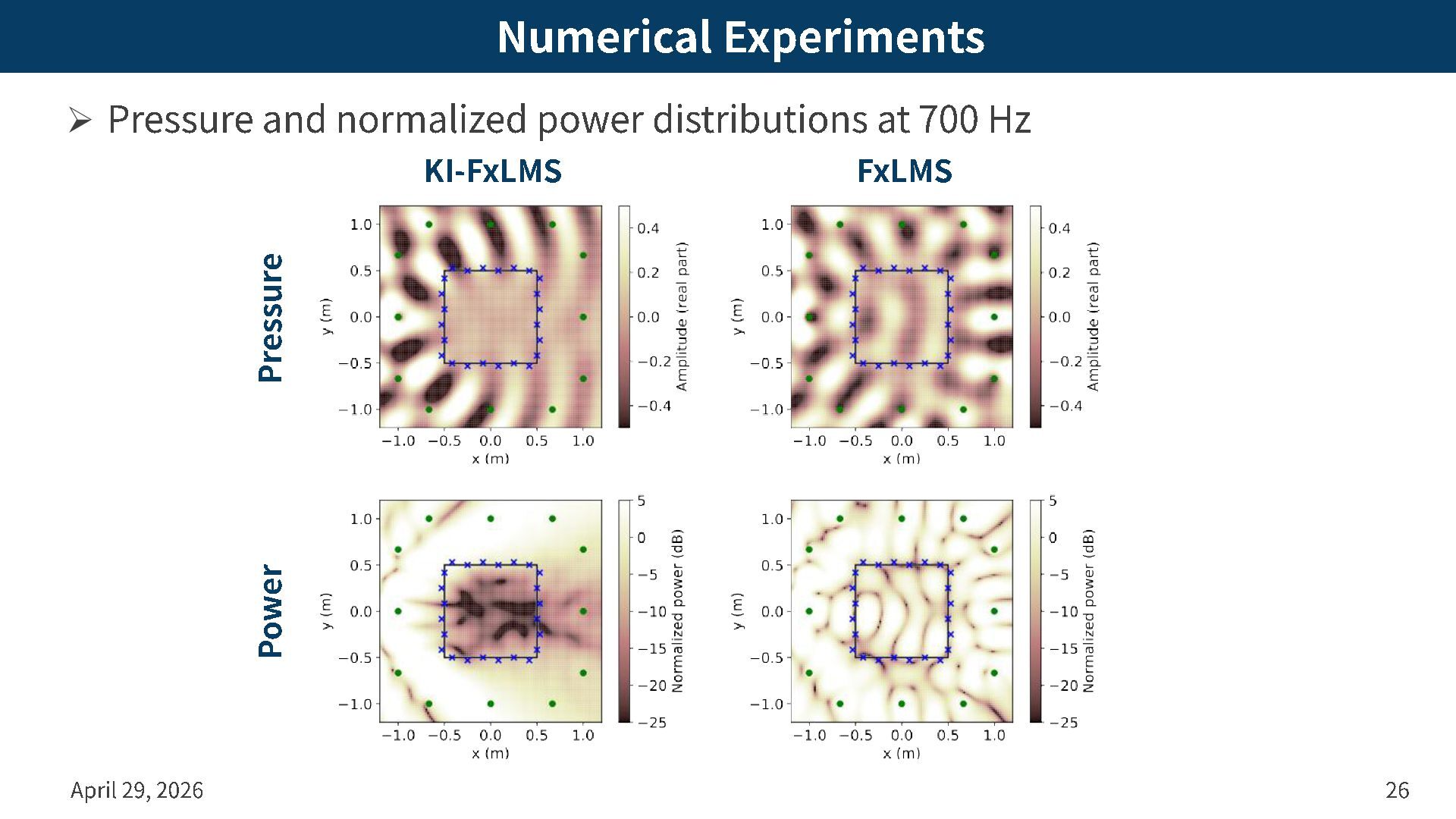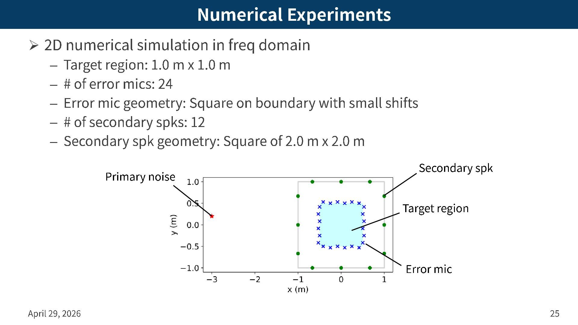 Target region: 1.0 m x 1.0 m – # of error mics: 24 – Error mic geometry: Square on boundary with small shifts – # of secondary spks: 12 – Secondary spk geometry: Square of 2.0 m x 2.0 m April 29, 2026 25 Primary noise Secondary spk Error mic Target region