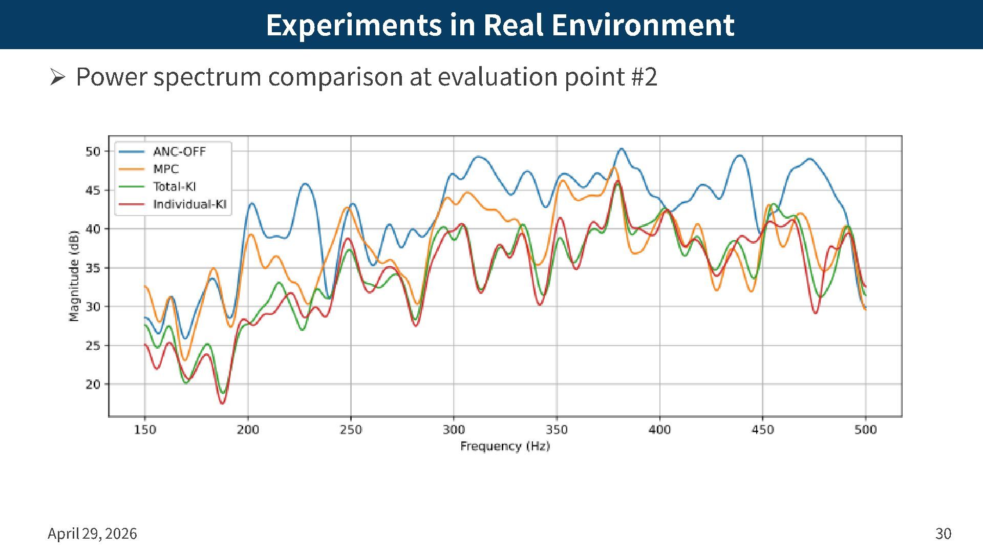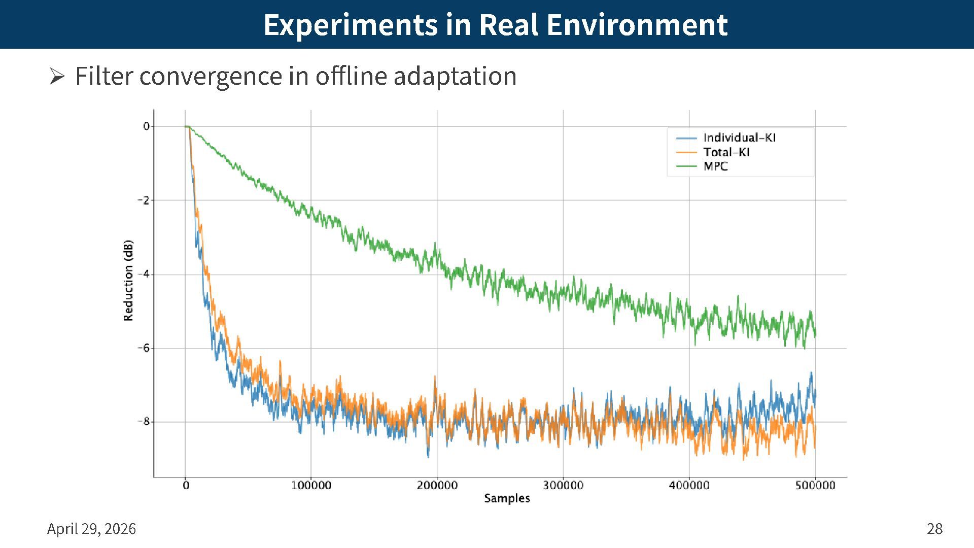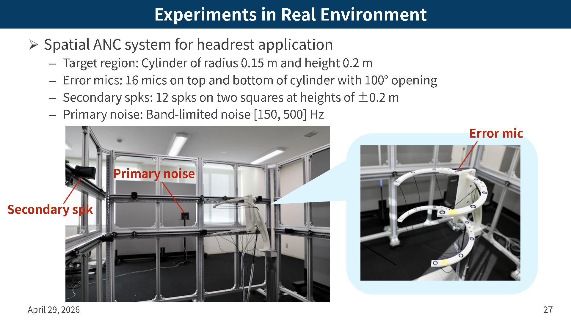 application – Target region: Cylinder of radius 0.15 m and height 0.2 m – Error mics: 16 mics on top and bottom of cylinder with 100 ° opening – Secondary spks: 12 spks on two squares at heights of ± 0.2 m – Primary noise: Band -limited noise [150, 500] Hz April 29, 2026 27 Primary noise Secondary spk Error mic