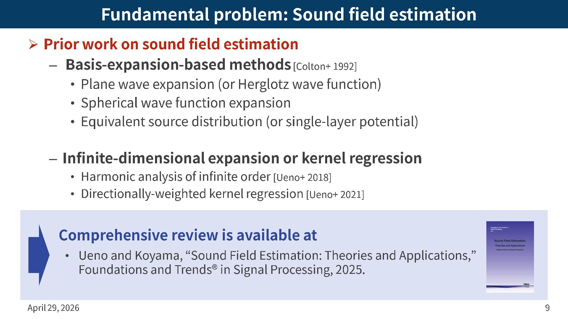 field estimation – Basis -expansion -based methods [Colton+ 1992] • Plane wave expansion (or Herglotz wave function) • Spherical wave function expansion • Equivalent source distribution (or single -layer potential) – Infinite -dimensional expansion or kernel regression • Harmonic analysis of infinite order [Ueno+ 2018] • Directionally -weighted kernel regression [Ueno+ 2021] April 29, 2026 9 Comprehensive review is available at • Ueno and Koyama, “Sound Field Estimation: Theories and Applications, ” Foundations and Trends ®️ in Signal Processing, 2025 .