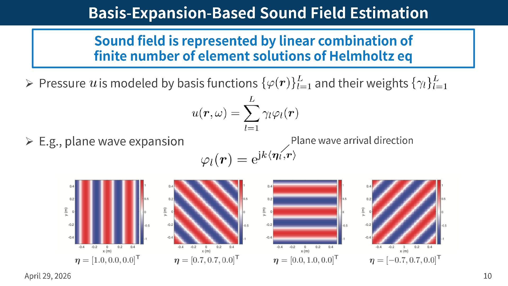 by basis functions and their weights ➢ E.g., plane wave expansion April 29, 2026 10 Sound field is represented by linear combination of finite number of element solutions of Helmholtz eq Plane wave arrival direction