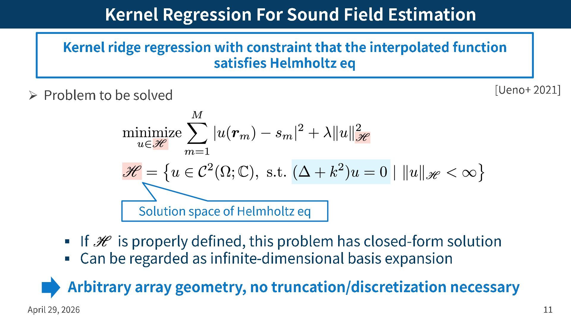 solved April 29, 2026 11 Kernel ridge regression with constraint that the interpolated function satisfies Helmholtz eq [Ueno+ 2021] Arbitrary array geometry, no truncation/discretization necessary ▪ If is properly defined, this problem has closed -form solution ▪ Can be regarded as infinite -dimensional basis expansion Solution space of Helmholtz eq