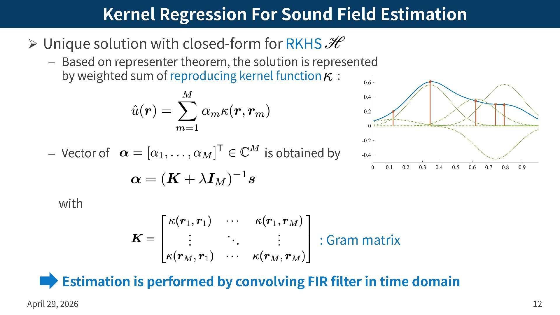 closed -form for RKHS – Based on representer theorem , the solution is represented by weighted sum of reproducing kernel function : – Vector of is obtained by with April 29, 2026 12 Estimation is performed by convolving FIR filter in time domain : Gram matrix