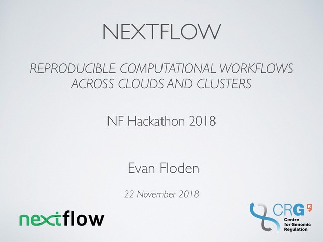 underestimated. • Nextflow does not provide a magic solution but enables best-practices and provide support for community and industry standards. • It strictly separates the application logic from the configuration and deployment logic, enabling self-contained workflows. • Applications can be easily deployed across different environment in a reproducible manner with a single command. • The functional/reactive model allows applications to scale to millions of jobs with ease.