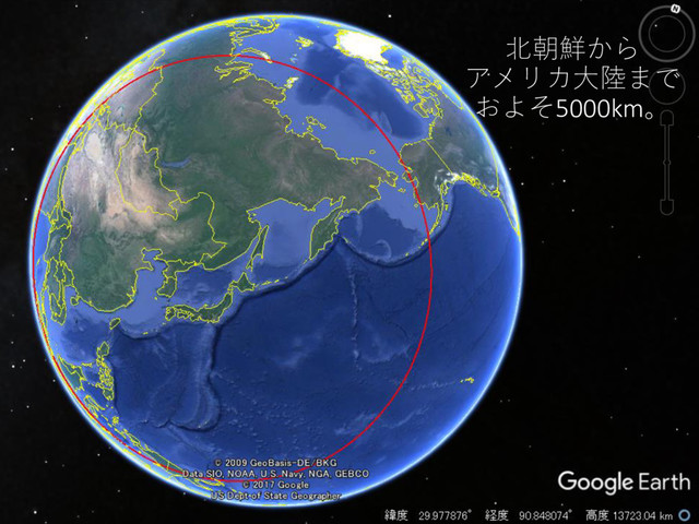 北朝鮮から アメリカ大陸まで およそ5000km。