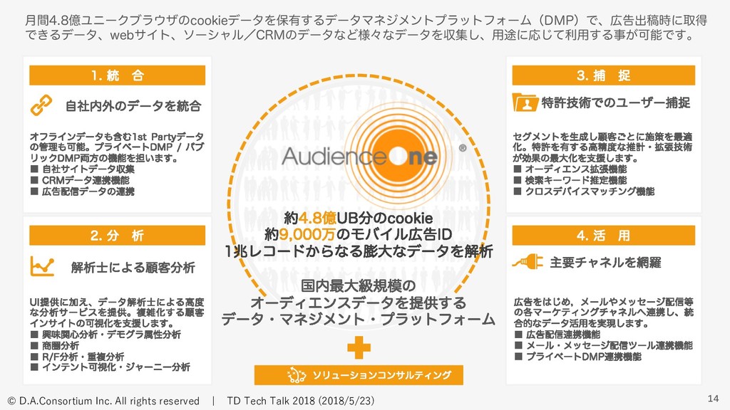5 ( ( 14 ౷ ߹ ੳ ั ଊ ׆ ༻ ΦϑϥΠϯσʔλؚΉTU 1BSUZσʔλ ͷཧՄೳɻϓϥΠϕʔτ%.1 ύϒ ϦοΫ%.1྆ํͷػೳΛ୲͍·͢ɻ ˙ ࣗࣾαΠτσʔλऩू ˙ $3.σʔλ࿈ܞػೳ ˙ ࠂ৴σʔλͷ࿈ܞ 6*ఏڙʹՃ͑ɺσʔλղੳ࢜ʹΑΔߴ ͳੳαʔϏεΛఏڙɻෳࡶԽ͢Δސ٬ ΠϯαΠτͷՄࢹԽΛࢧԉ͠·͢ɻ ˙ ڵຯؔ৺ੳɾσϞάϥଐੑੳ ˙ ݍੳ ˙ 3'ੳɾॏෳੳ ˙ ΠϯςϯτՄࢹԽɾδϟʔχʔੳ ηάϝϯτΛੜ͠ސ٬͝ͱʹࢪࡦΛ࠷ద ԽɻಛڐΛ༗͢Δߴਫ਼ͳਪܭɾ֦ுٕज़ ͕ޮՌͷ࠷େԽΛࢧԉ͠·͢ɻ ˙ ΦʔσΟΤϯε֦ுػೳ ˙ ݕࡧΩʔϫʔυਪఆػೳ ˙ ΫϩεσόΠεϚονϯάػೳ ࠂΛ͡Ίɼϝʔϧϝοηʔδ৴ ͷ֤ϚʔέςΟϯάνϟωϧ࿈ܞ͠ɺ౷ ߹తͳσʔλ׆༻Λ࣮ݱ͠·͢ɻ ˙ ࠂ৴࿈ܞػೳ ˙ ϝʔϧɾϝοηʔδ৴πʔϧ࿈ܞػೳ ˙ ϓϥΠϕʔτ%.1࿈ܞػೳ ݄ؒԯϢχʔΫϒϥβͷDPPLJFσʔλΛอ༗͢ΔσʔλϚωδϝϯτϓϥοτϑΥʔϜʢ%.1ʣͰɺࠂग़ߘ࣌ʹऔಘ Ͱ͖ΔσʔλɺXFCαΠτɺιʔγϟϧʗ$3.ͷσʔλͳͲ༷ʑͳσʔλΛऩू͠ɺ༻్ʹԠͯ͡ར༻͢Δࣄ͕ՄೳͰ͢ɻ ιϦϡʔγϣϯίϯαϧςΟϯά ࣗࣾ֎ͷσʔλΛ౷߹ ղੳ࢜ʹΑΔސ٬ੳ ಛڐٕज़ͰͷϢʔβʔัଊ ओཁνϟωϧΛཏ ԯ6#ͷDPPLJF ສͷϞόΠϧࠂ*% ஹϨίʔυ͔ΒͳΔେͳσʔλΛղੳ ࠃ࠷େڃنͷ ΦʔσΟΤϯεσʔλΛఏڙ͢Δ σʔλɾϚωδϝϯτɾϓϥοτϑΥʔϜ