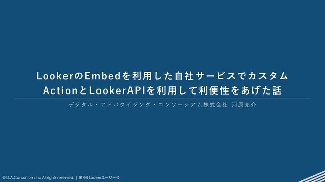 All rights reserved. | 第7回 Lookerユーザー会 デ ジ タ ル ・ ア ド バ タ イ ジ ン グ ・ コ ン ソ ー シ ア ム 株 式 会 社 河 原 亮 介 LookerのEmbedを利⽤した⾃社サービスでカスタム ActionとLookerAPIを利⽤して利便性をあげた話