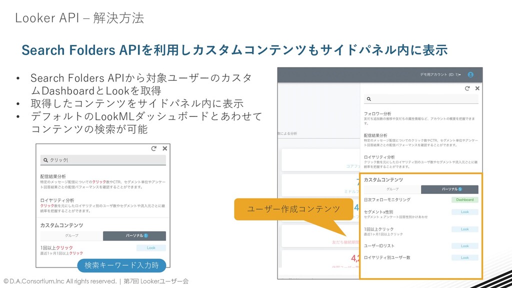 ‒ 解決⽅法 Search Folders APIを利⽤しカスタムコンテンツもサイドパネル内に表⽰ • Search Folders APIから対象ユーザーのカスタ ムDashboardとLookを取得 • 取得したコンテンツをサイドパネル内に表⽰ • デフォルトのLookMLダッシュボードとあわせて コンテンツの検索が可能 検索キーワード⼊⼒時 ユーザー作成コンテンツ