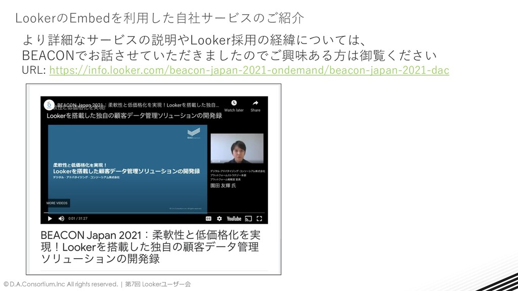© D.A.Consortium.Inc All rights reserved. | 第7回 Lookerユーザー会 より詳細なサービスの説明やLooker採⽤の経緯については、 BEACONでお話させていただきましたのでご興味ある⽅は御覧ください