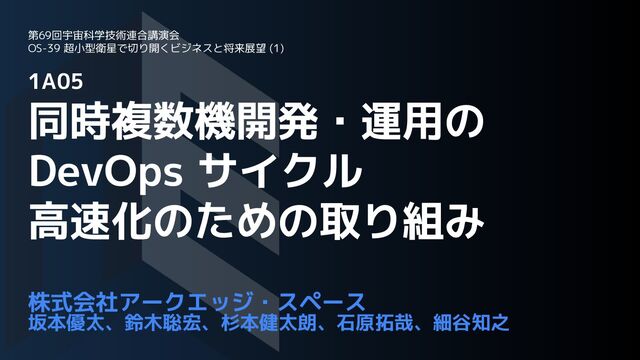 第69回宇宙科学技術連合講演会 11/25(1日目) OS-39 超小型衛星で切り開くビジネスと将来展望 (1)1A05 にて発表した、 『同時複数機開発・運用のDevOpsサイクル高速化のための取り組み 』のスライドです。