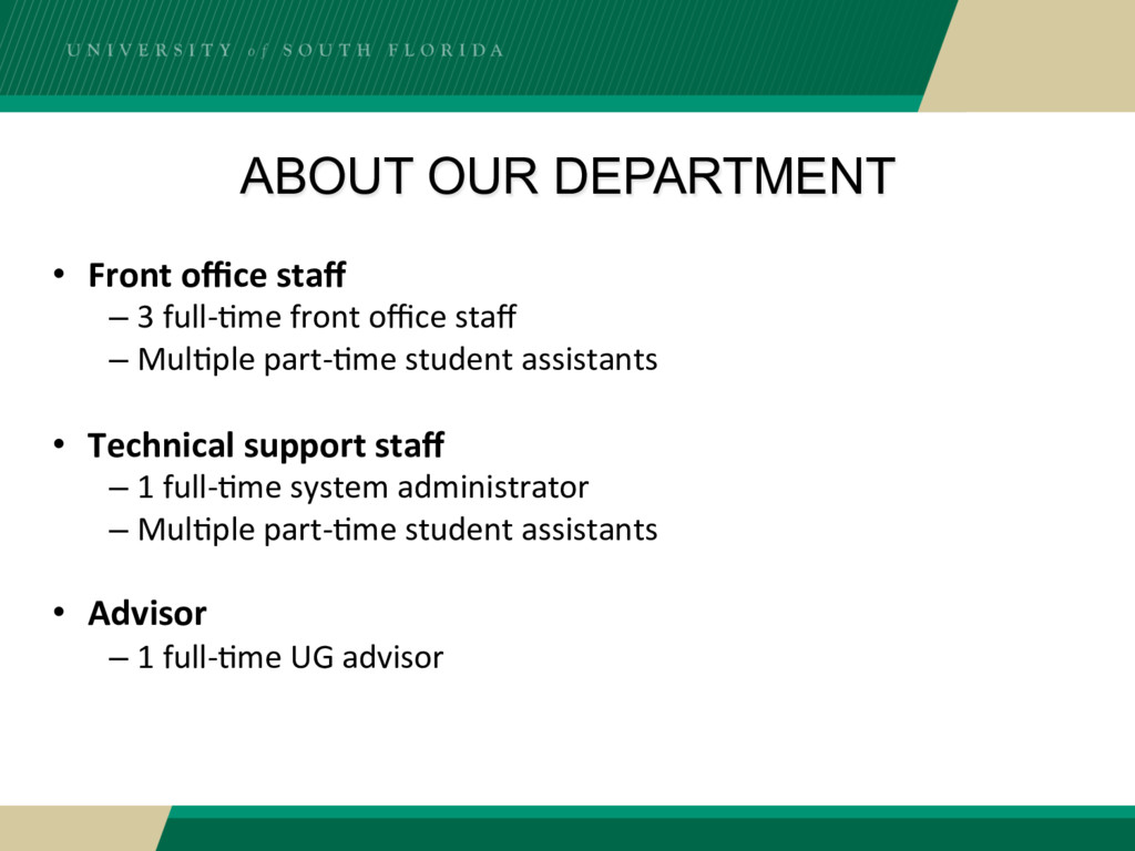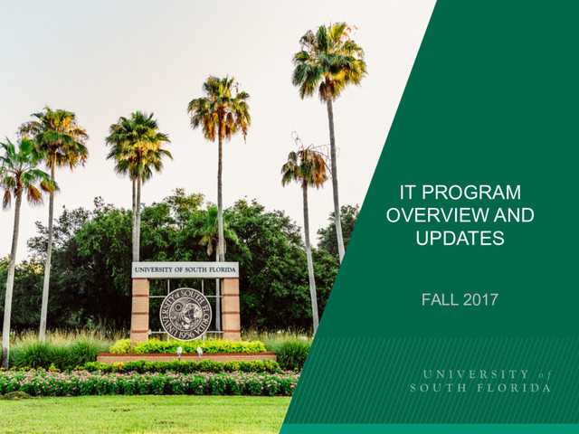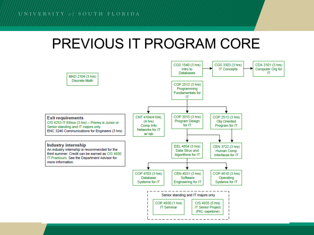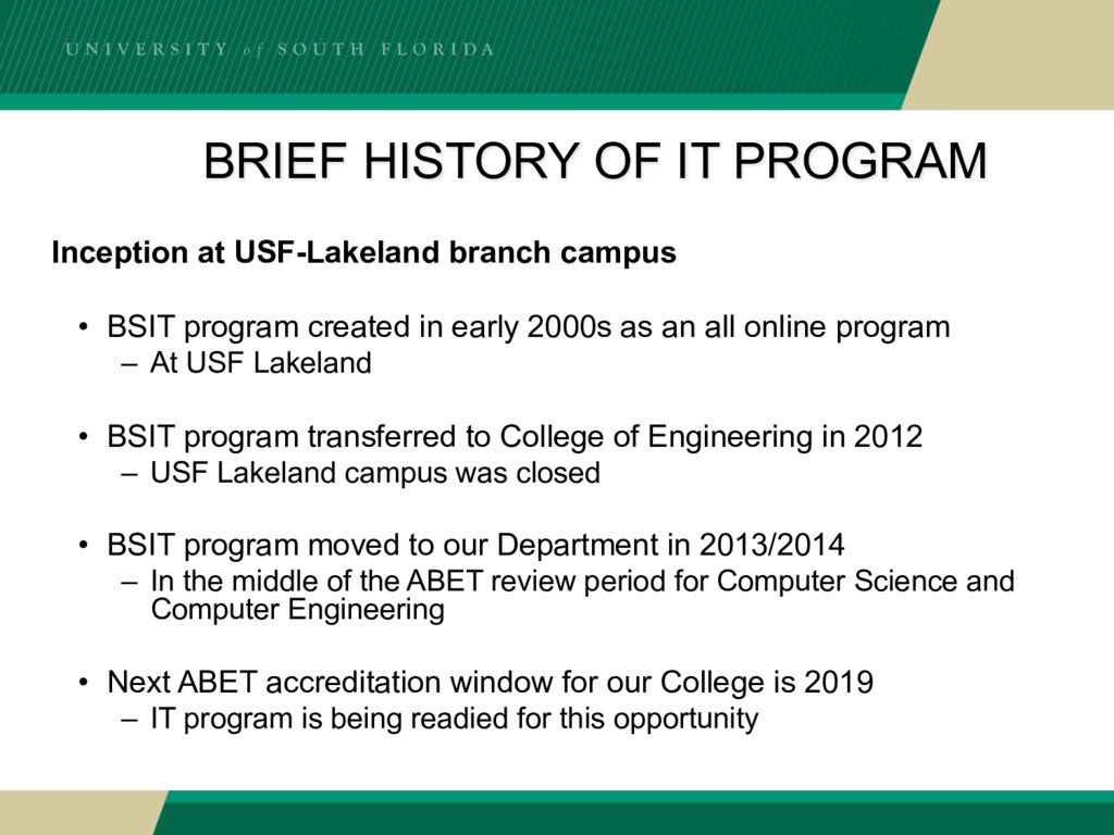 • BSIT program created in early 2000s as an all online program – At USF Lakeland • BSIT program transferred to College of Engineering in 2012 – USF Lakeland campus was closed • BSIT program moved to our Department in 2013/2014 – In the middle of the ABET review period for Computer Science and Computer Engineering • Next ABET accreditation window for our College is 2019 – IT program is being readied for this opportunity