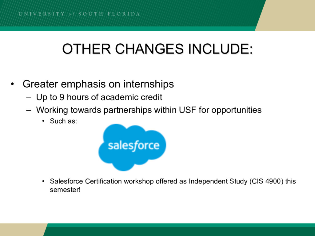 to 9 hours of academic credit – Working towards partnerships within USF for opportunities • Such as: • Salesforce Certification workshop offered as Independent Study (CIS 4900) this semester!