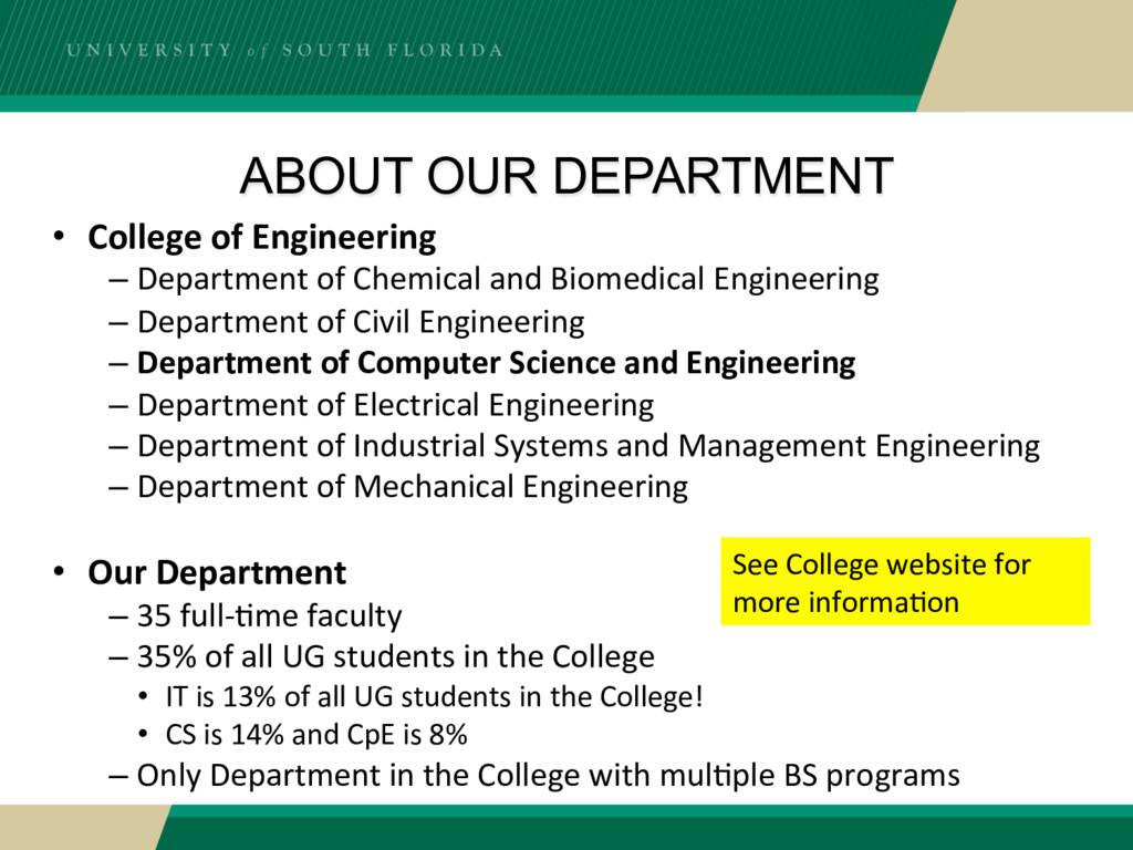 and Biomedical Engineering – Department of Civil Engineering – Department of Computer Science and Engineering – Department of Electrical Engineering – Department of Industrial Systems and Management Engineering – Department of Mechanical Engineering • Our Department – 35 full-?me faculty – 35% of all UG students in the College • IT is 13% of all UG students in the College! • CS is 14% and CpE is 8% – Only Department in the College with mul?ple BS programs See College website for more informa?on