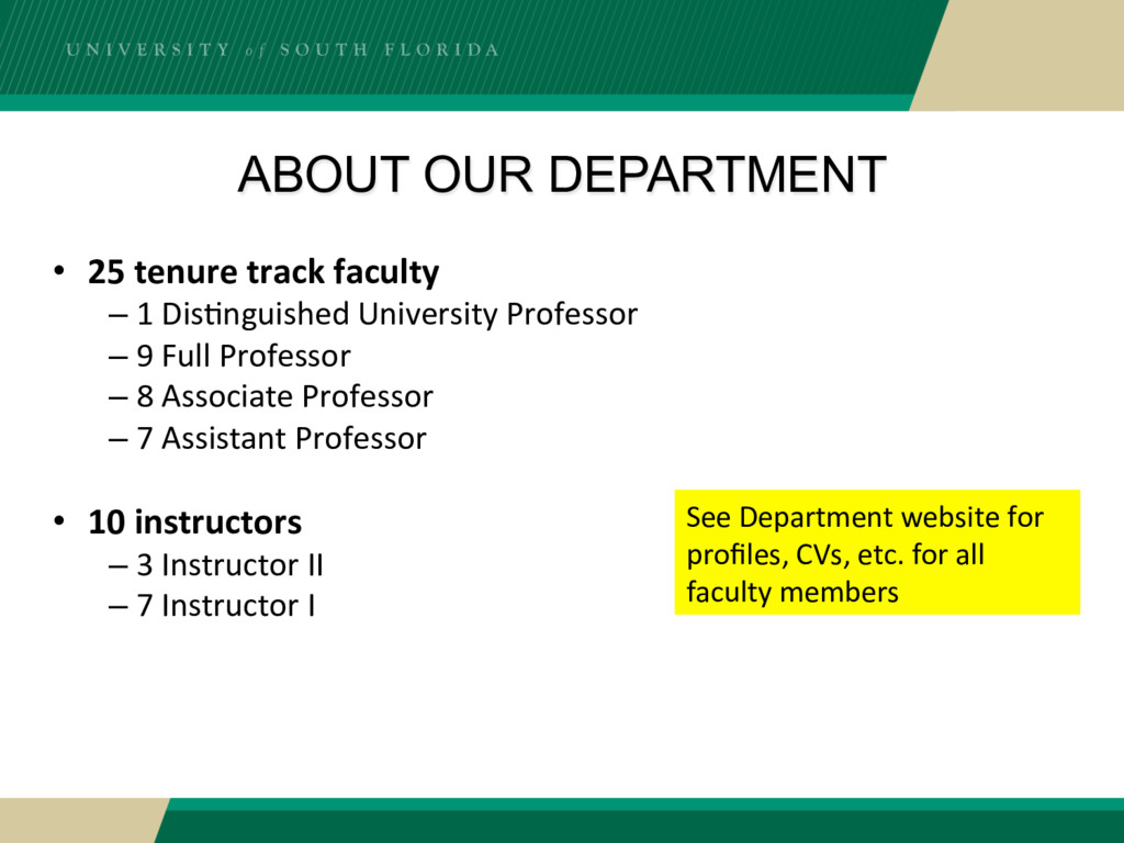 for all faculty members • 25 tenure track faculty – 1 Dis?nguished University Professor – 9 Full Professor – 8 Associate Professor – 7 Assistant Professor • 10 instructors – 3 Instructor II – 7 Instructor I