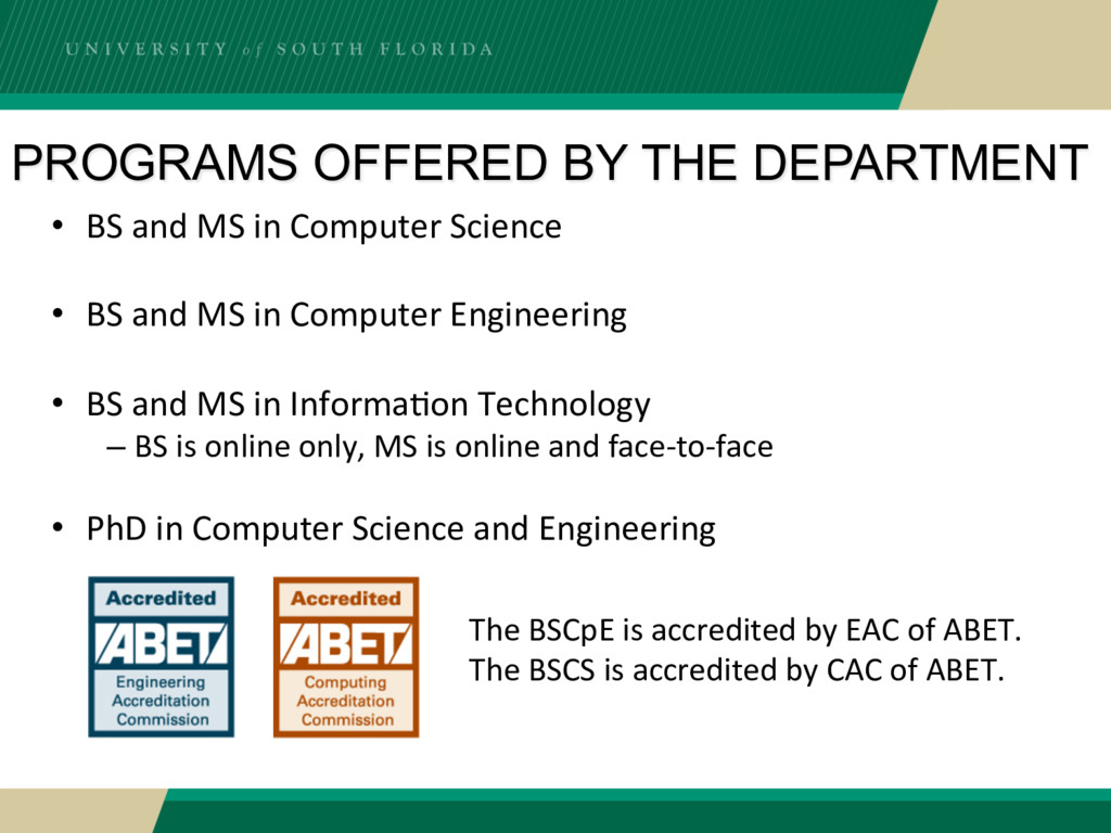 Computer Science • BS and MS in Computer Engineering • BS and MS in Informa?on Technology – BS is online only, MS is online and face-to-face • PhD in Computer Science and Engineering The BSCpE is accredited by EAC of ABET. The BSCS is accredited by CAC of ABET.