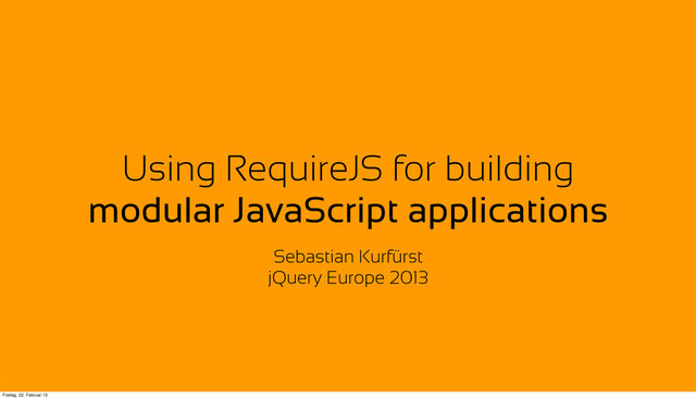 config for // jquery.slider and jquery.tooltip define( ["jquery", "jquery.slider", "jquery.tooltip"], function($) { // the jquery.slider.js and jquery.tooltip.js // have been loaded. $(function() { $('body').slider(); }); }); Freitag, 22. Februar 13