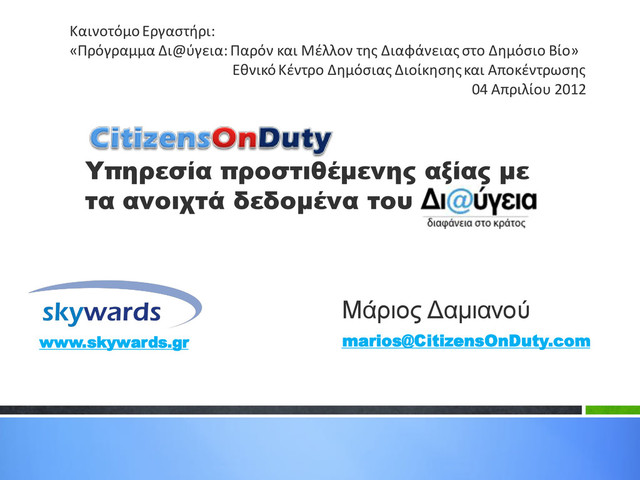 πολίτες, ομάδες πολιτών, κοινωνικές οργανώσεις να ενεργοποιηθούν και συνεργαστούν με τους αρμόδιους τοπικούς φορείς για να βελτιώσουν την ποιότητα ζωής και τις παρεχόμενες υπηρεσίες στην γειτονία, την περιοχή, τον δήμο ή την πόλη τους. http://citizensonduty.com Σκοπός μας είναι να προσφέρουμε ένα σύγχρονο εργαλείο στον ενεργό πολίτη προκειμένου να παρεμβαίνει στην δημόσια ζωή. Φιλοδοξούμε να ενεργοποιήσουμε τους πολίτες με άποψη που ποτέ πριν δεν εξέφρασαν την θέση τους γιατί απλώς δεν είχε καμιά ανταπόκριση.