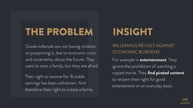 it, due to economic crisis and uncertainty about the future. They want to start a family, but they are afraid. 1/10 Their right to receive fair & stable earnings has been withdrawn. And therefore their right to create a family. INSIGHT For example in entertainment. They ignore the prohibition of watching a copied movie. They find pirated content to reclaim their right for good entertainent on an everyday basis. MILLENIALS REVOLT AGAINST ECONOMIC BURDENS