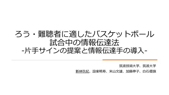 概要:バスケットボールでは攻守の切り替えが激しいスポーツであり,試合中に正確な情報を迅速に伝える必要がある.しかし,ろう・難聴者は,補聴器・人工内耳の有無に関わらず,特に背後から指示を受け取るのが難しい.したがって,本研究では,試合中のプレイへの影響が少ない「片手サイン」を提案するとともに,その指示内容の認識を常時可能とする「情報伝達手」を新たに導入する.ここで,情報伝達手は,コートの周囲に複数人配置し,選手の表出する片手サインを読み取ると同時に,同じサインを表出することで背後からの指示を理解できるようになる.本論文では,提案した片手サインの妥当性と情報伝達手の最適配置の評価実験を行うとともに,実利用に向けた課題について議論する.