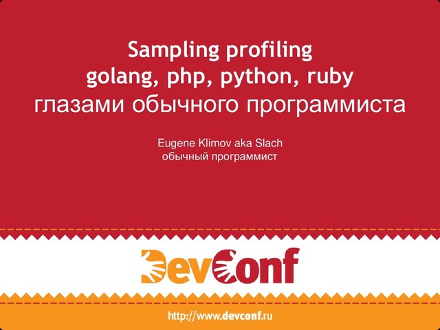 но в PHP через боль • Ставим в систему XHProf (pecl install xhprof) • Прописываем в php.ini xhprof_sample_enabled • Низкая точность sample rate 0.1sec, сделал рабочий fork для php7 - https://github.com/Slach/xhprof/ [PHP] auto_prepend_file=/tmp/xhprof_sampling.php [xhprof] extension = xhprof.so xhprof.output_dir = /tmp/xhprof
