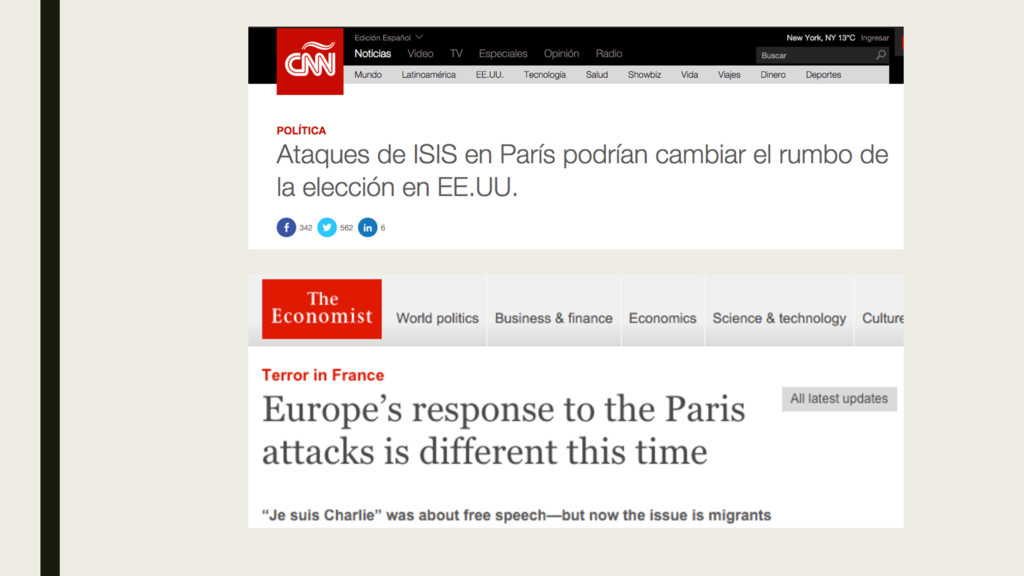Madrid 2004, con 350+ heridos, 129 muertos. ▪ François Holland, presidente de Francia culpa a ISIS. ▪ Declaración de guerra (3ª Guerra Mundial). ▪ #Pray4Paris ▪ Solidaridad por la tragedia ▪ Visión religiosa: incluyendo declaraciones del papa. ▪ Terrorismo mundial ▪ Inmigrantes como problema ▪ Discriminación