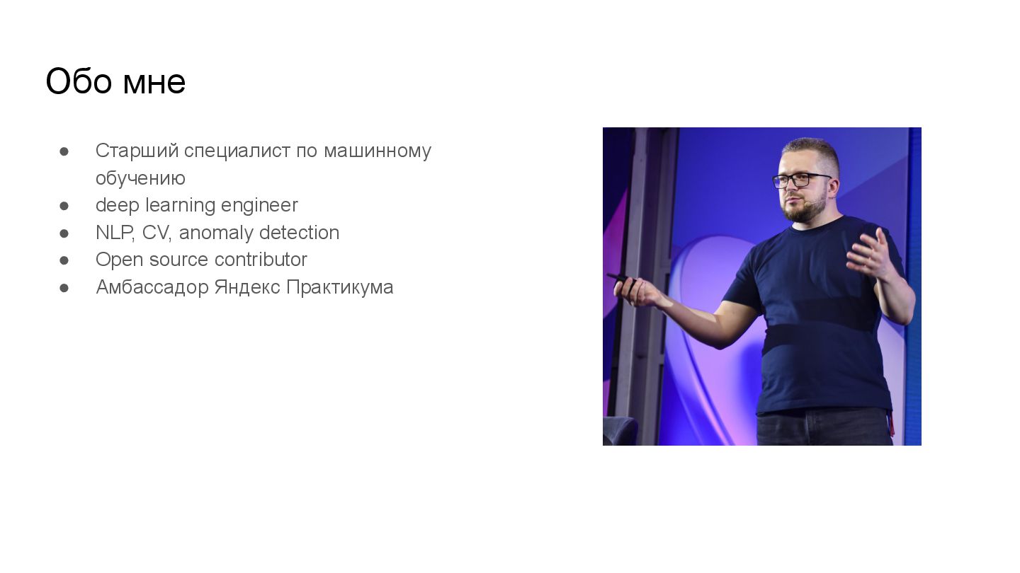 learning engineer • NLP, CV, anomaly detection • Open source contributor • Амбассадор Яндекс Практикума