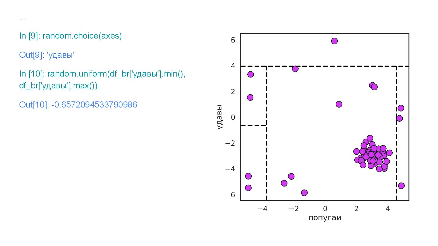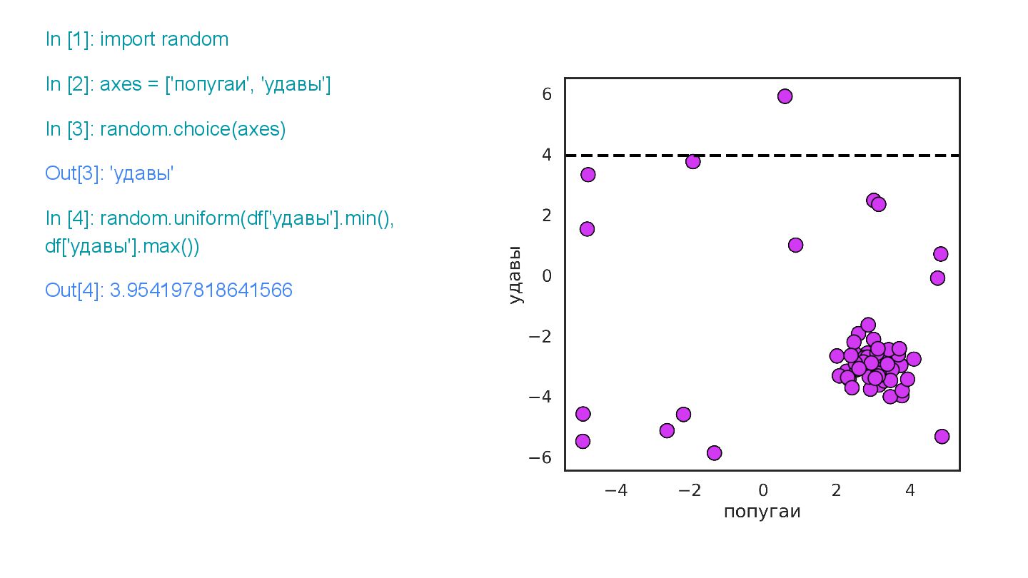 … In [7]: random.choice(axes) Out[7]: 'попугаи' In [8]: random.uniform(df_bl['попугаи'].min(), df_bl['попугаи'].max())